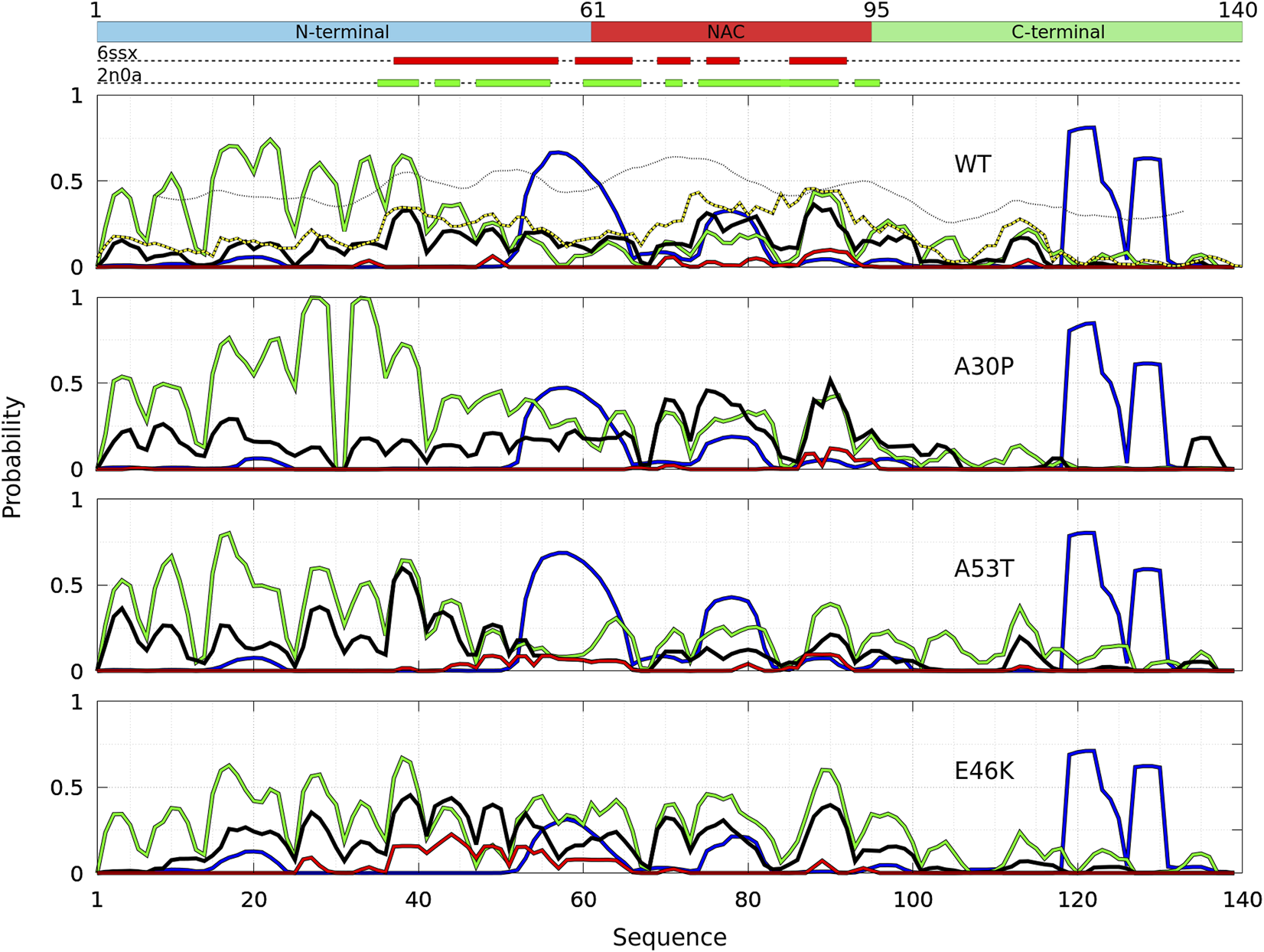 As shown in Figure 2, it is remarkable to observe that a single mutation has huge effects on the relative weights of the different local regions having high aggregation propensity in the WT. The effects of a single amino-acid substitution are not limited to residues close to the mutation: the single amino-acid substitution has long-range effects on the mean contact. Compared to the WT, the main differences are as follows: 1) a larger propensity to aggregate in the N-terminal region for A53T and E46K and smaller for A30P, 2) a larger propensity to aggregate in the NAC region for A30P and lower for A53T, and 3) E46K has a propensity to aggregate larger than the WT all along the sequence excepted in region A76-I88 of the NAC. The largest peak of A30P is located at G69-V70-V71 corresponding to a succession of three hydrophobic residues. The highest propensity to aggregate is maximum at L38 for A53T and at V49 for E46K. The contribution of the C-term is modest and only significant close to L113 (except for A30P) and to Y136 (mainly for A30P).