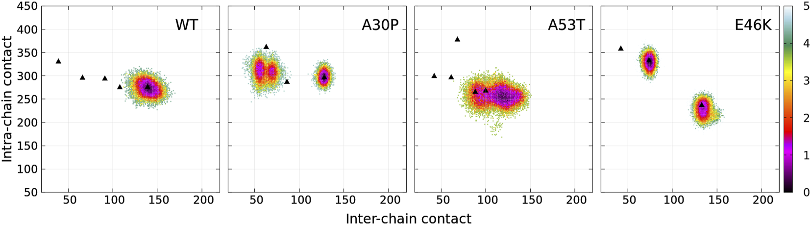 The dimensionless (effective) free-energy landscape of the Dfncs was computed from the two-dimensional probability density P of the number of inter-chain (ninter) and intra-chain (nintra) contacts between the residues for the WT and the mutants (Figure 7). For the WT and A53T, the Dfncs is located in one basin, whereas for A30P and E46K, two distinct clusters are visible. Some of the fibril clusters are located at the local minima of the global free-energy landscape (Figure 1), except for A53T. For A30P and E46K, one of the two clusters of Dfncs occurs at the global minimum of the global free-energy landscape (Figure 1). This indicates that Dfncs are more probable to be formed for these two mutants. In fact, the sub-ensemble of Dfncs represents 14.04% and 15.73% for A30P and E46K, respectively. For the WT and A53T, the population of Dfncs is only 8.33 and 10.65%, respectively. It is worth noting that these numbers indicate that the majority of dimers are disordered aggregates at least on the effective time scale (millisecond) of the present simulations.