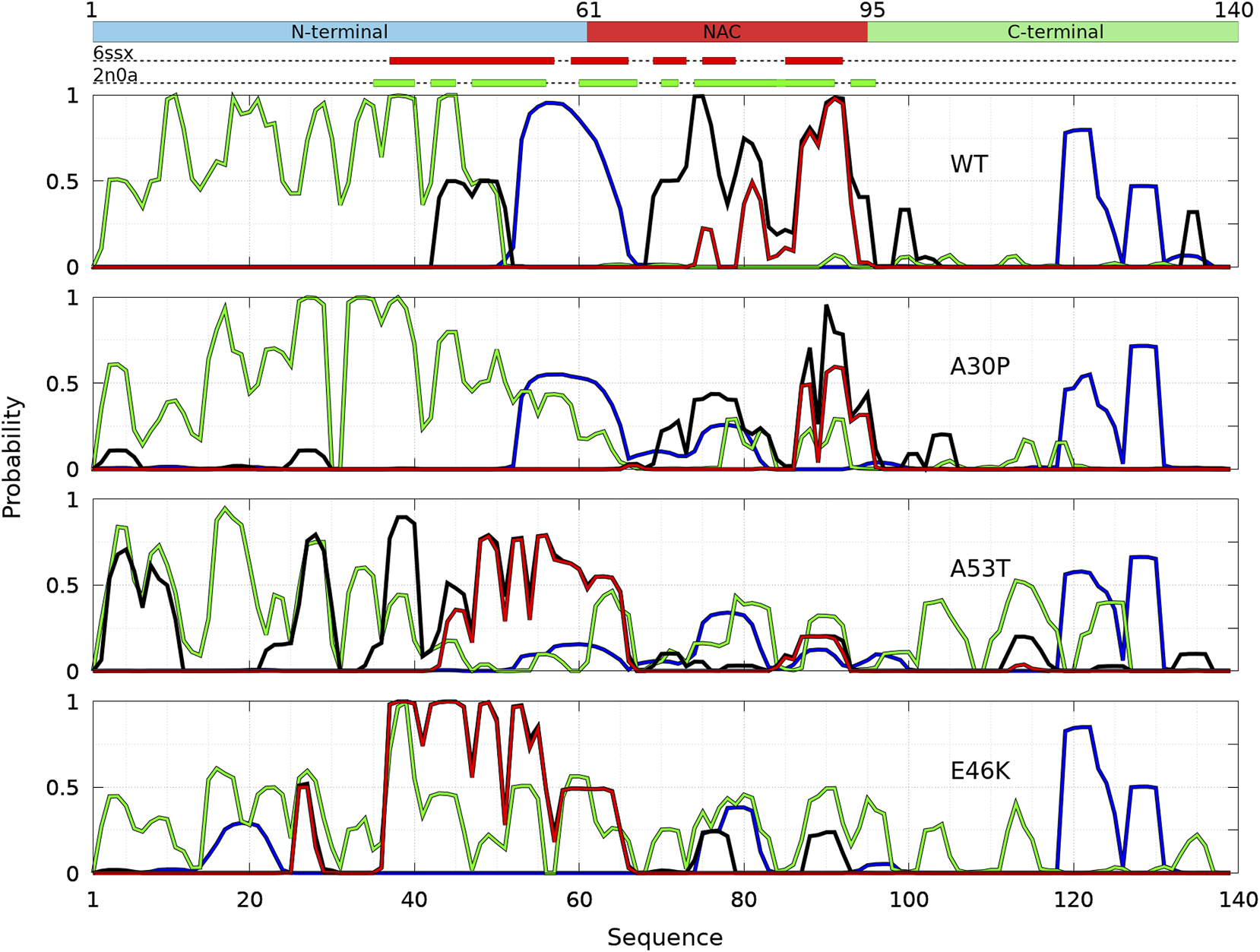 Analysis of the secondary structures in the sub-ensemble of α-syn dimers with native fibril-type contacts found in molecular dynamics simulations for the WT and the mutants at 300 and 310 K. Probabilities for each residue to pertain to an α-helix (blue), to an intra-molecular β-sheet (green), to an intermolecular β-sheet (black), and to a native intermolecular β-sheet fibril type (red).