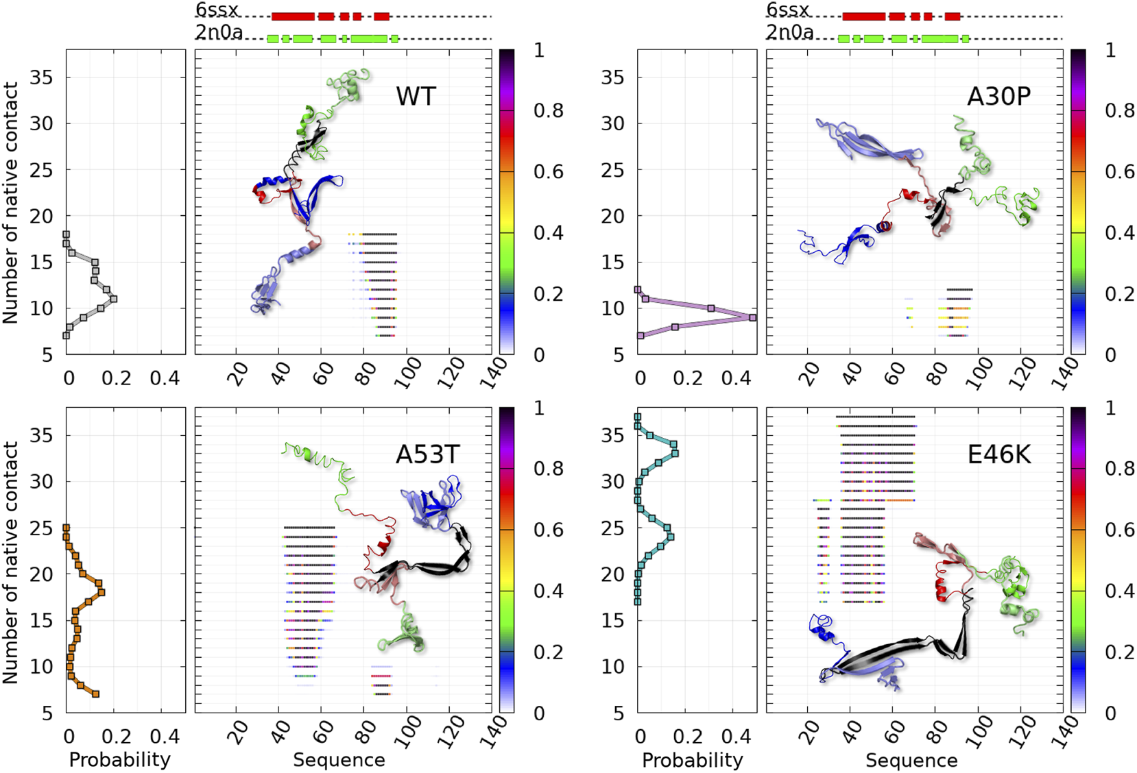 Analysis of the mean contact probability along the amino-acid sequence for the sub-ensemble of Dfncs found in MD trajectories for the WT and variants. For each protein, the left panel represents the probability density of the number of contacts and the right panel represents its distribution along the sequence for each point of the distribution, with a color code giving the probability at each residue according to the color bar on the right. 3D structure representatives of the maximum number of native fibril-type contacts are shown with the following color: N-terminal (blue), NAC (red), C-terminal (green), and native contact region (black).