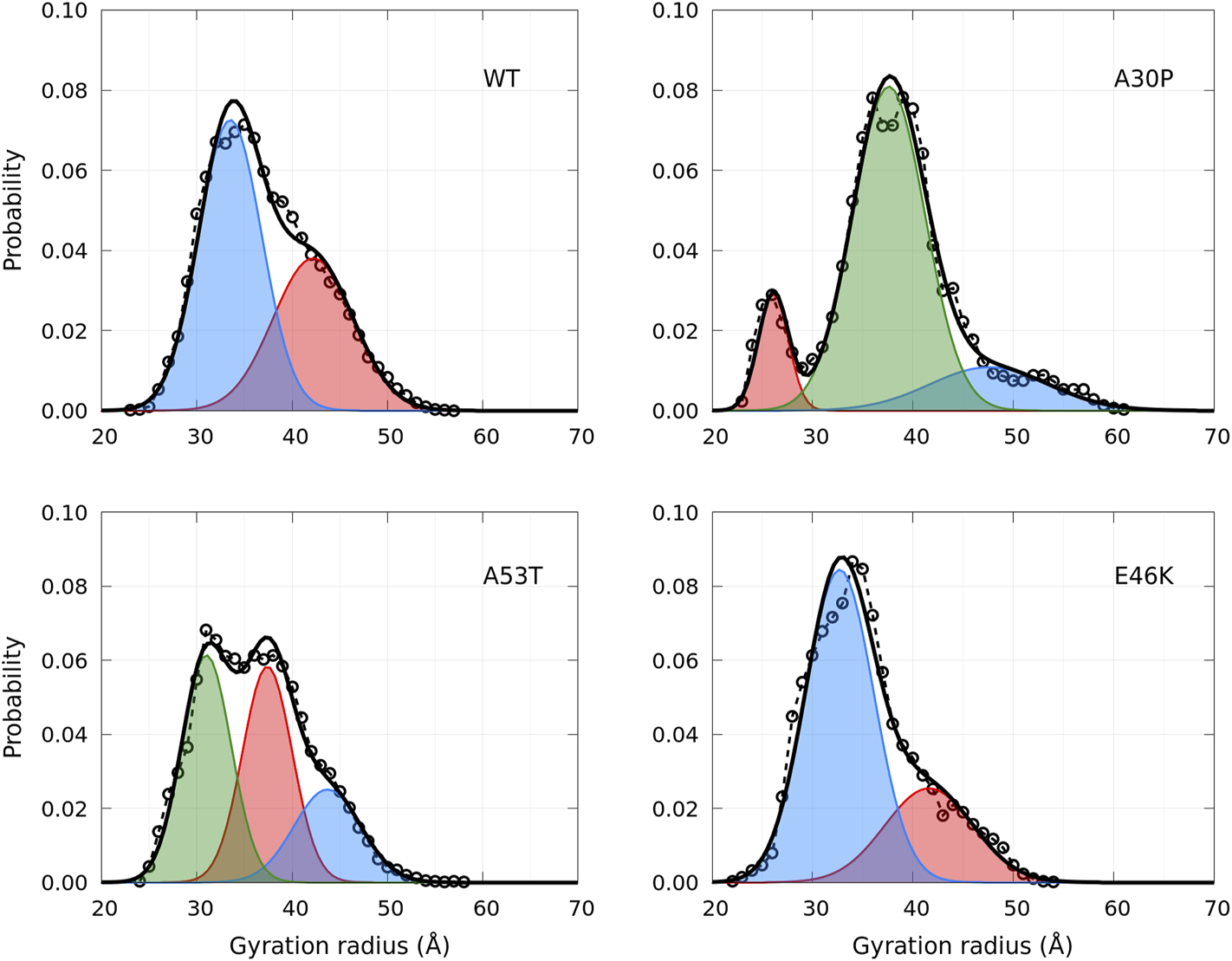 Probability density functions of the gyration radius for the WT and mutants computed from MD simulations (circle symbols and dashed lines). Each distribution is represented by a set of Gaussians (colored areas), the number and the parameters of which were found by applying the GMM algorithm. The sum of Gaussians is represented by a full black line.