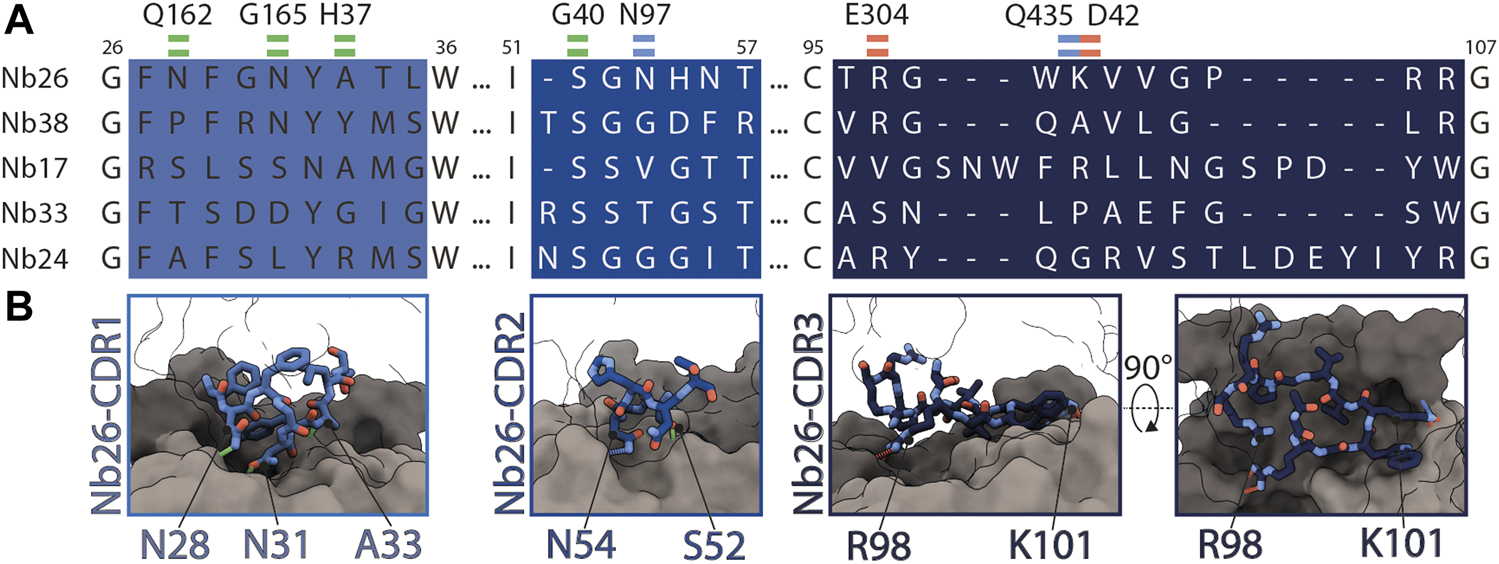 Interactions between Nb26 and DtpC. (A) The sequences of the five nanobodies representing five different families, obtained after selection, with their complementary determining regions (CDR) are shown. Interactions of Nb26 with DtpC are highlighted as green (hydrogen bonds involving the protein backbone), blue (hydrogen bonds involving side chains) and red dashes (salt bridges). (B) These interactions are further displayed in 3D. CDR regions are depicted as sticks on the surface of DtpC where the N-terminal bundle is colored in grey, and the C-terminal bundle in dark grey.