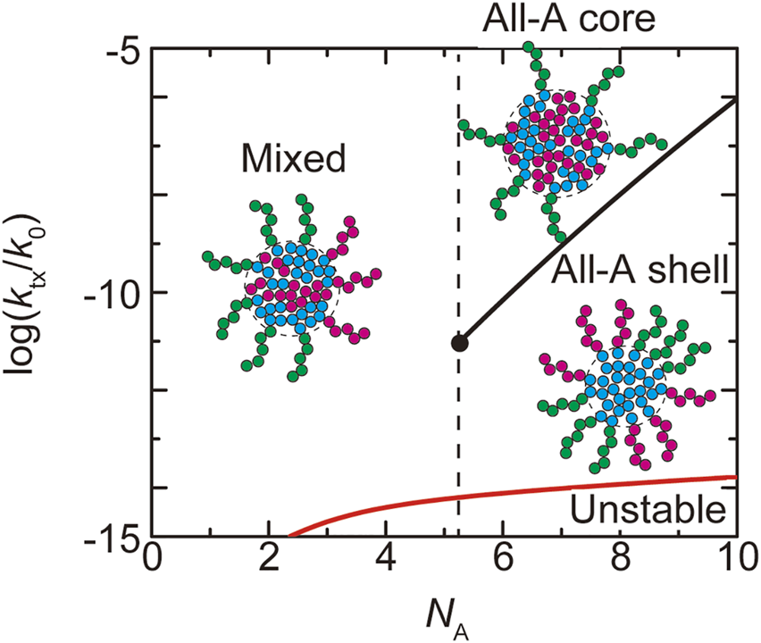 The first and second terms are the stretching free energy of the B blocks in the core and are derived in the spirit of Semenov 1985, see Supplementary Section S1. The third term is the free energy due to the interactions between the A and B units in the core. For cases in which the number of the A blocks is relatively large, these blocks may aggregate to minimize the repulsive interactions between A and B units. However, to keep the simplicity of the theory, we derived the third term of Eqn. 2 by assuming that the fraction of the A blocks are distributed uniformly in the core, independent of the number of units in A blocks. With the assumption with which the core is packed with A and B blocks, the volume has the formwhere is the radius of the core. is the geometrical factor (Semenov 1985). The interaction parameter accounts for the excluded volume interactions between the A blocks and the B blocks. and are the volume fractions of the A blocks and the B blocks in the core, respectively. The core is occupied by the A and B blocks, .