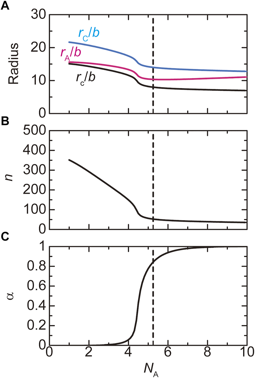 The radius (A), the number of copolymers (B), and the fraction of A blocks in the shell (C) of paraspeckles are shown as functions of the number NA of units of the A blocks. In a, we showed the radius of the core of a paraspeckle (black), the distance between the top of the A blocks and the center of the paraspeckle (magenta), and the distance between the top of C blocks and the center of the paraspeckle (cyan). The (natural) logarithm of the production rate of copolymers is fixed to -12.0. The values of parameters used for the calculations are = 40.0, = 15.0, = 0.5, = 1.0, = 1.0, and = 1.5. The vertical broken line indicates the critical number of units in A blocks.