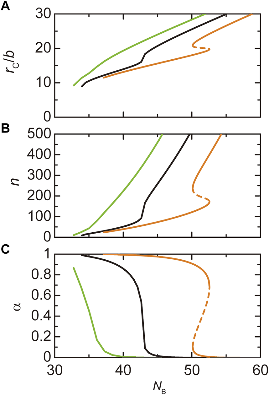 The radius (A), the number of transcripts (B), and the fraction of the A blocks in the shell (C) of a paraspeckle is shown as functions of the number of units in the B blocks for cases in which the number of units in the A blocks is 3.0 (light green), 5.33231 (black), and 8.0 (orange). The (natural) logarithm of the transcription rate is fixed to −12.0. The values of parameters used for the calculations are = 15.0, = 0.5, = 1.0, = 1.0, and = 1.5.