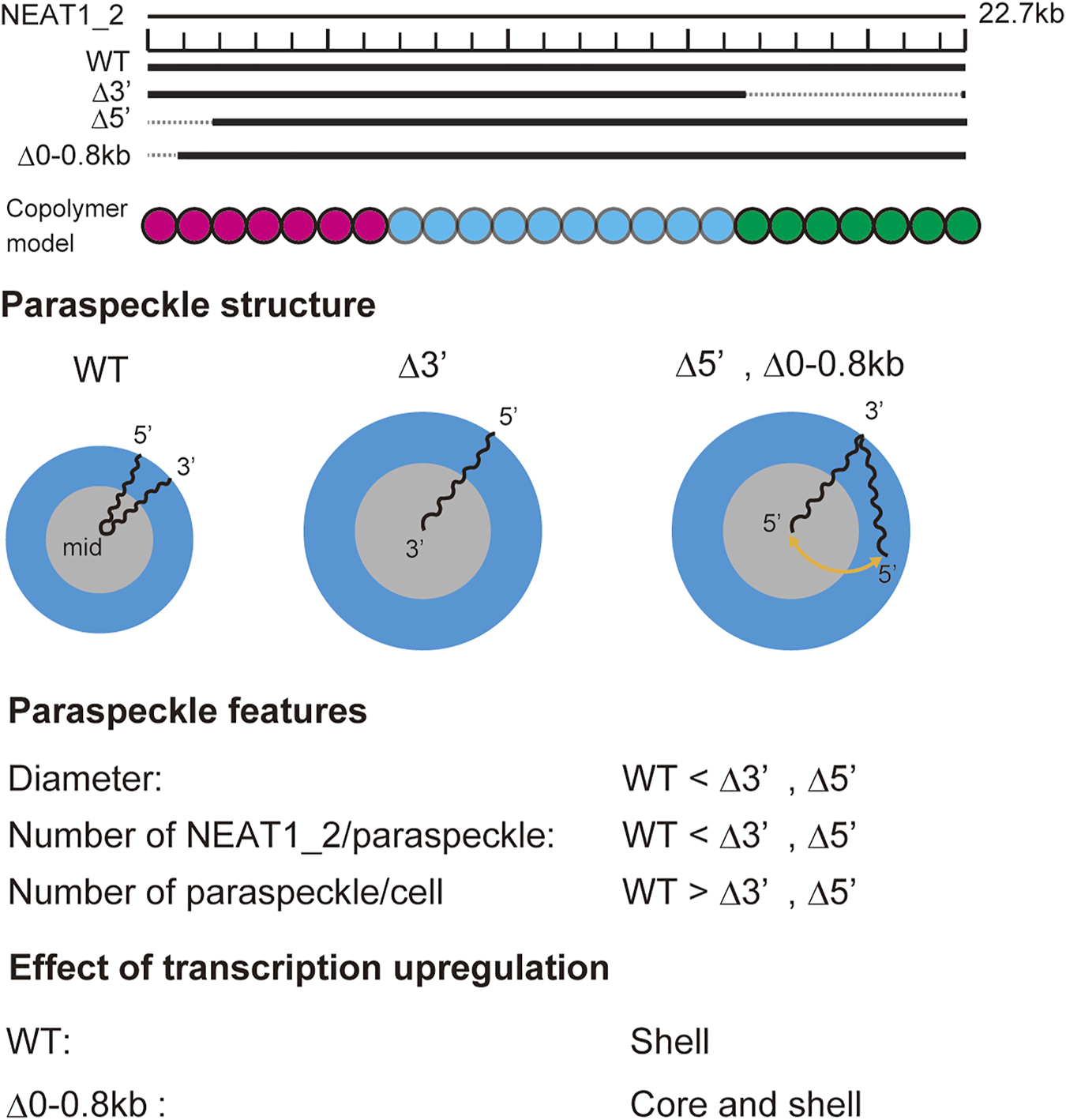 Summary of experimental results on paraspeckles in wild type and deletion mutants (Yamazaki et al., 2021). Copolymer model is schematic and the borders of A, B, and C blocks remain to be experimentally characterized.
