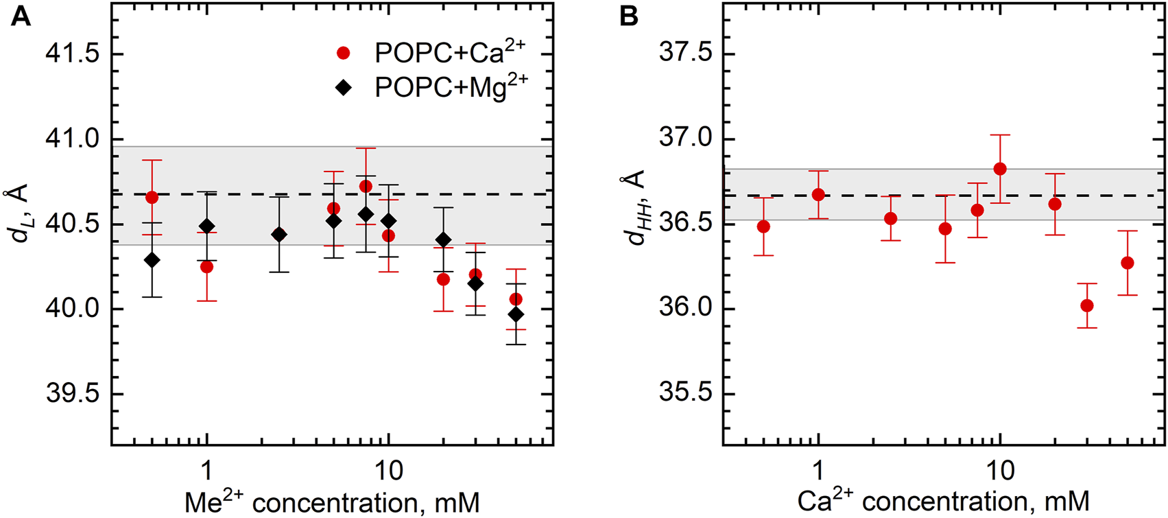 FIGURE 5. The changes of POPC bilayer thickness (dL and dHH) as a function of Ca2+ and Mg2+ concentrations at 25°C according to (A) SANS and (B) SAXS measurements. Dashed lines represent dL and dHH of neat POPC ULVs with the wide gray bands depicting their standard deviations.