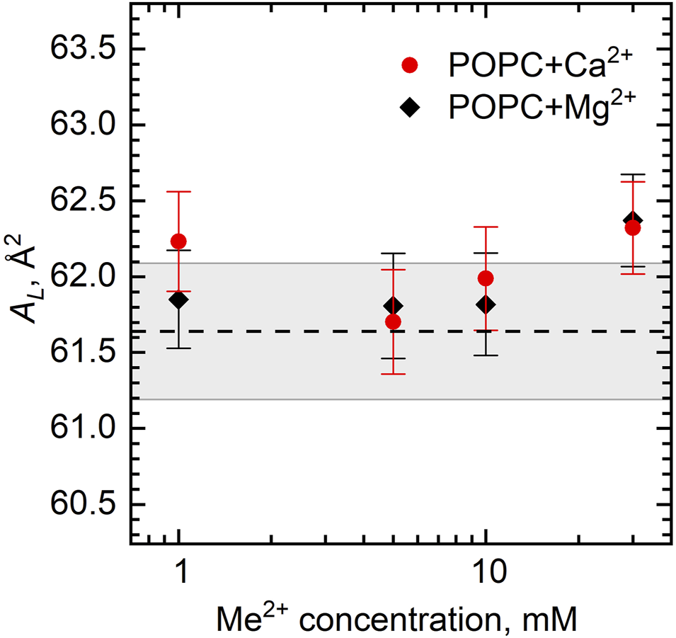 FIGURE 6. Area per lipid AL of the POPC bilayer as a function of Ca2+ and Mg2+ concentrations. The dashed line represents AL of neat POPC with the wide gray band depicting its standard deviation.