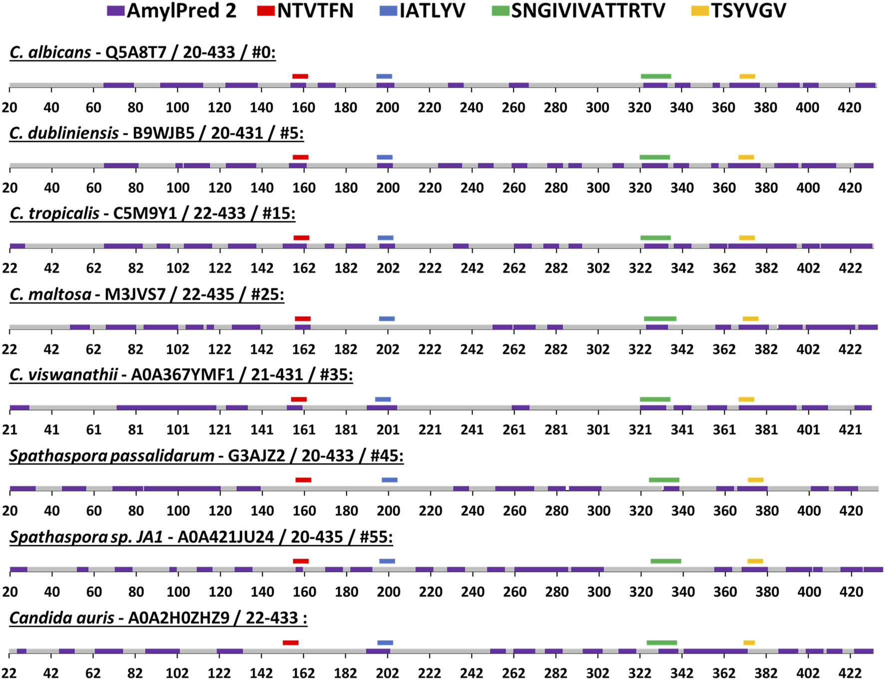 For the calculations of the amyloidogenic propensity of the entire Ig-like/invasin and T domains, we selected seven orthologs (homologs with a common ancestral parent in different species). Six of those were chosen along the ranked 71 homologs in gaps of 10 (starting from C. dubliniensis orthologs located five places away from the original C. albicans Als5). To these six, we added the emerging pathogen Candida auris, which was not a part of the homologs collected by the ConSurf webserver due to low sequence identity to the C. albicans Als5p (Willaert, 2018; Willaert et al., 2021). The multiple sequence alignment of the 71 homologs along with the C. auris sequence was obtained by reproducing the ConSurf search with similar parameters but lower sequence identity of 25%–95%, and then filtering out the irrelevant homologs using Jalview2.