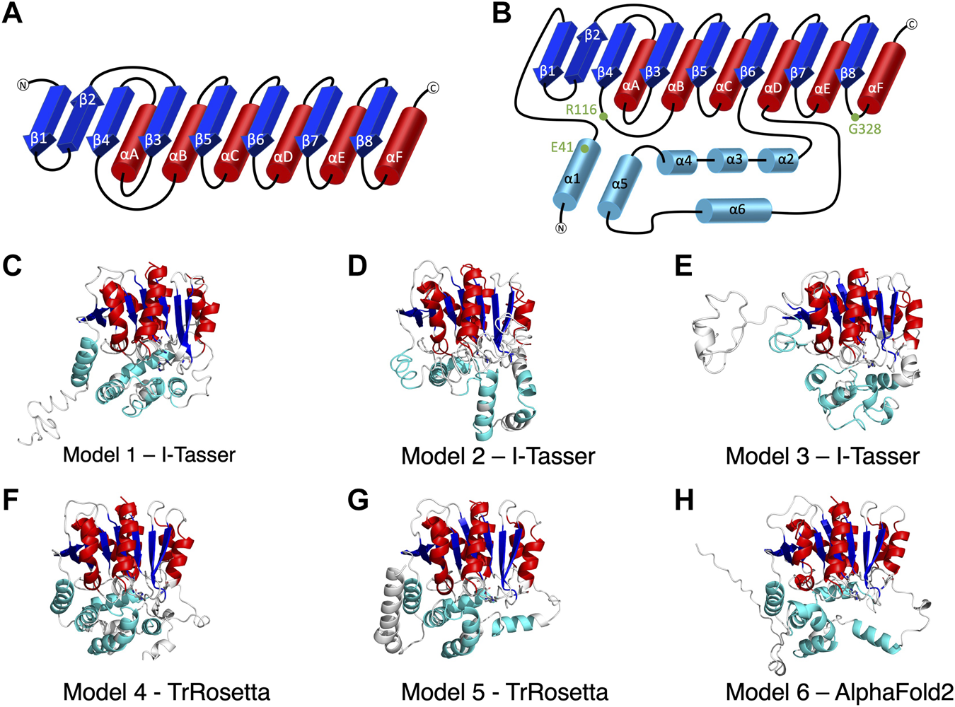 The secondary structure of alpha/beta hydrolase domain-containing 5 (ABHD5). (A) The secondary structure diagram of the “canonical” α/β hydrolase fold characterized by six α helices (red) and eight β strands (blue). The catalytic triad in the α/β hydrolase fold family is made up of 1) a nucleophilic residue (Ser, Cys, or Asp) after β5, 2) an acidic residue after β7, and 3) a conserved His after β8. (B) The secondary structure diagram of ABHD5 with two insertion regions (cyan). The first insertion region is an α helix (α1), located before β1, and the second insertion region is composed of five α helices (α2–α6) between β6 and αD. (C–H) The six models of ABHD5 built from different homology modeling tools. Models 1, 2, and 3 are from I-TASSER; Models 4 and 5 are from TrRosetta; and Model 6 is from AlphaFold2. The “canonical” six α helices and eight β strands for all models are shown in red and blue cartoon representations, respectively. The six insertion α helices are shown in cyan. The secondary structures are defined as: insertion α1 (residues 33–46), β1 (residues 53–59), β2 (residues 64–71), β3 (residues 80–84), αA (residues 89–103), β4 (residues 106–111), αB (residues 126–143), β5 (residues 149–154), αC (residues 157–171), β6 (residues 172–181), insertion α2 (residues 198–207), insertion α3 (residues 221–229), insertion α4 (residues 232–240), insertion α5 (residues 245–257), insertion α6 (residues 259–270), αD (residues 278–288), β7 (residues 292–298), αE (residues 305–314), β8 (residues 319–325), and αF (residues 331–351). Asn155, Asp303, and H329 are drawn in sticks with the carbon atoms in white, nitrogen atoms in blue, and oxygen atoms in red. The hydrogen atoms are not shown.