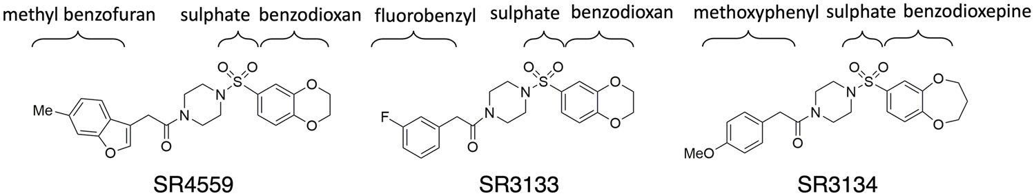 The 2D sketches of the three sulfonyl piperazine (SPZ) ligands.