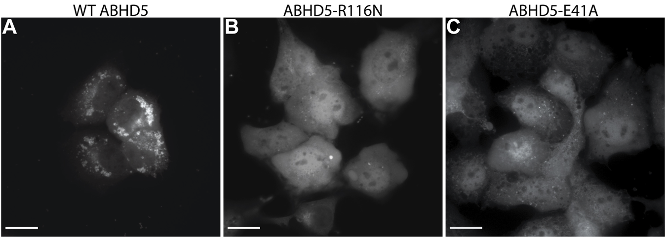 Fluorescence imaging reveals the importance of R116 and E41 in the basal localization of ABHD5. (A) Wild-type (WT) ABHD5-mCherry localizes to the LDs within COS7 cells. Either the (B) R116N or (C) E41A mutations demonstrate a cytosolic distribution of ABHD5-mCherry and inhibited basal LD targeting in the absence of ATGL and PLIN5 expression. (A–C) The scale bars represent 20 µm.