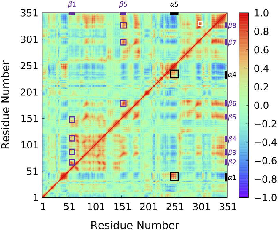 Correlation map for 1-µs GaMD trajectory of Model 6. The correlation between β1 and β2–β5 as well as the correlation between α5 and β6–β8 are highlighted using purple boxes. The correlation between insertion helix α5 and insertion helices α1 and α4 are highlighted with black boxes. The correlation formed by R299, G328, and D334 is highlighted by a white box.