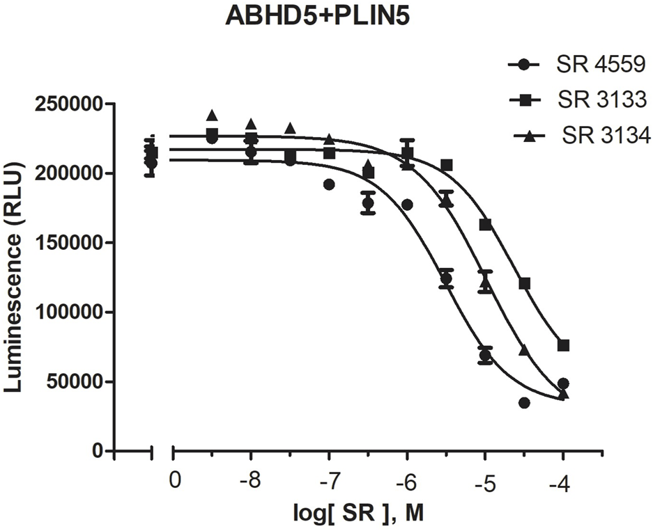 The binding of SPZ ligands to ABHD5 was assessed by dose-response curves of ABHD5-PLIN5 binding. ABHD5-PLIN5 binding was assessed by luciferase complementation assays of Cos7 lysates. Each ligand has micromolar IC50 values with specific binding to ABHD5 (Sanders et al., 2015).