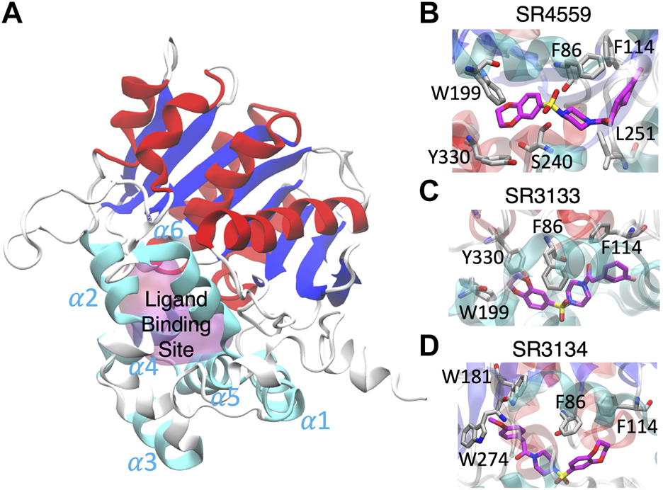 The ligand binding modes of SPZ ligands. (A) SPZ ligands bind to the pocket (magenta) formed by insertion helices, α2-α6 (cyan). Red and blue indicate the canonical α helices and β strands, respectively. (B–D) reveal the residues (carbons in gray) interacting with SR4559, SR3133, and SR3134 (carbons in magenta), respectively.