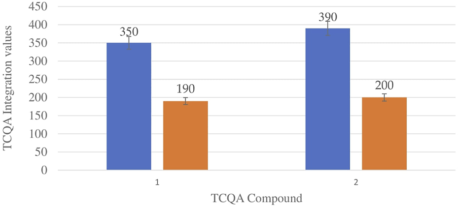 Chlorogenic acids (CGA) are a type of natural substance that can be found in a variety of plant species, and as such are of special interest in many research studies. Since the main CGA represented in nature is caffeoylquinic acid (CQA), it is therefore often used as a quality control indicator for a variety of natural products (Gil and Wianowska, 2017). On that account, and on the presence of these compounds in Helichrysum species as reported in previous studies (Gradinaru et al., 2014; Grinev et al., 2016), this study hence focused on evaluating specifically CQA distribution and its derivatives of other classes of compounds namely dicaffeoylquinic acids (DCQA) and tricaffeoylquinic acids (TCQA) in the chemical profile of H. aureonitens. Given that a variety of mechanisms may be involved in plant metabolite production, this study investigated whether CQA accumulation in H. aureonitens is affected by seasonal fluctuations and the species’ growing site. The extracts were treated to ultra-performance liquid chromatography-quadrupole time-of-flight mass spectroscopy (UPLC-qTOF-MS) and Table 3 lists the compounds from the extracts that have been detected. Eleven isomers of CGA from three derivatives of CQA were detected in this study, four isomers of CQA (monocaffeoylquinic acids), six isomers of DCQA and one isomer of TCQA.