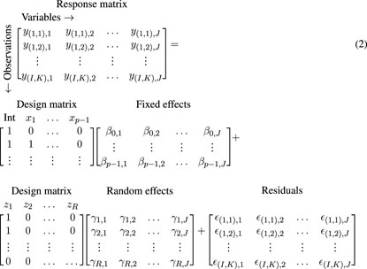 where Y is an IK × J response matrix, X is an IK × p design matrix, B is a p × J parameter matrix, Z is an IK × R design matrix for random effects, U is an R × J random parameters matrix, and E is an IK × J residual matrix. Equation 1 can also be written as