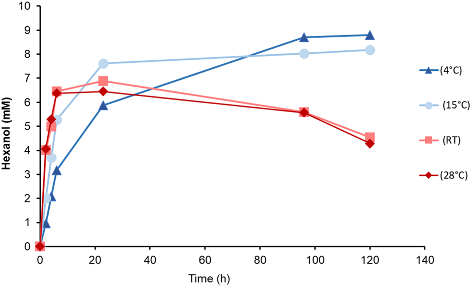 In a long-term experiment, whole cells of the Co-transformant induced with MeOH, were incubated at different temperatures (Figure 5). We aimed to determine both the reaction rate and the recovery of produced GLV, in order to find the most suitable reaction temperature and reaction time. A substrate feed was implemented after 6 h, because of cellular consumption of linoleic acid. Although the highest detected level of hexanol was at 4°C, subsequent experiments were done at 15°C, which seemed to be a good compromise in terms of substrate solubility and product loss. Interestingly, more than 8 mM hexanol was detected after 100 h, reaching almost the same level as the samples incubated at 4°C. However, the initial product formation rate of cells incubated at 15°C was much higher, giving a higher yield in a shorter incubation period. Cells at 15°C showed fastest production of hexanol, reaching almost 8 mM after 23 h.