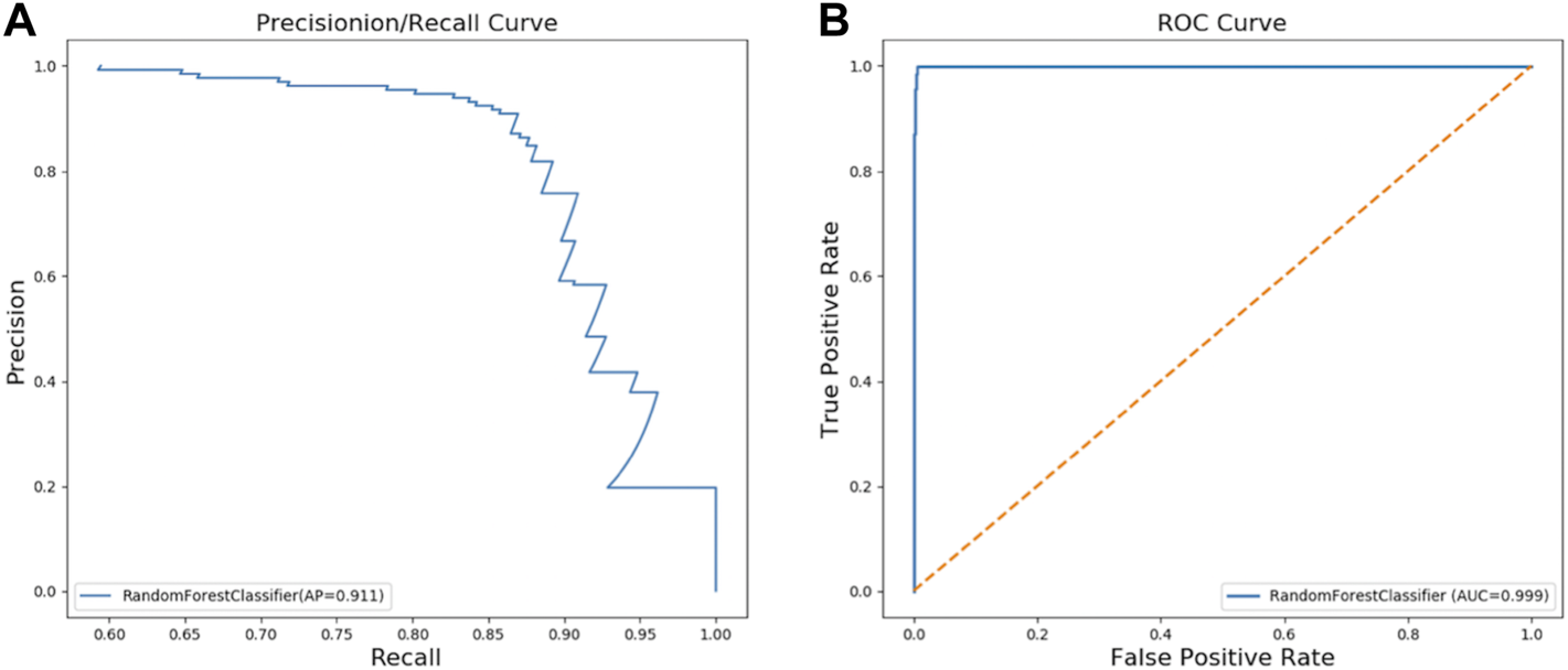 Two curves for PKU screening using RFC in the validation dataset: (A) PR curve; (B) ROC curve.