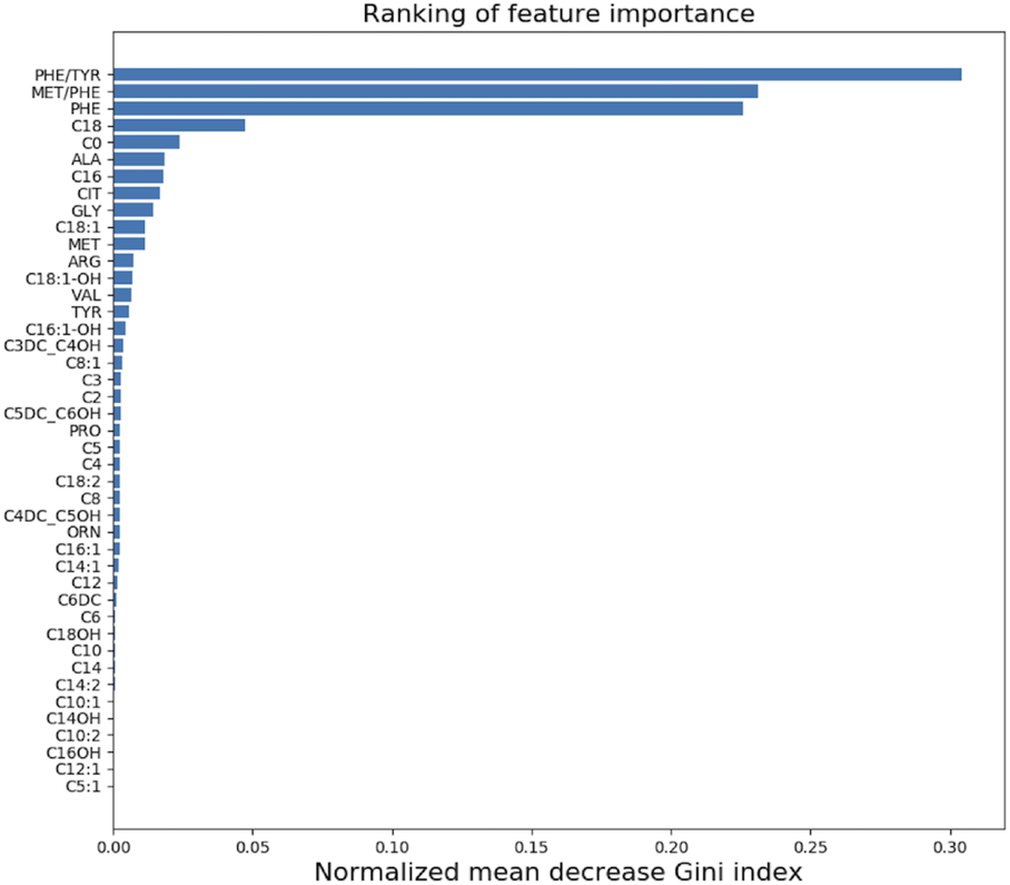 Three of the top-ranked features including PHE/TYR, MET/PHE and PHE play the most important roles for RFC model. All the 43 features importance for the model construction of PKU screening can be seen in Figure 3.