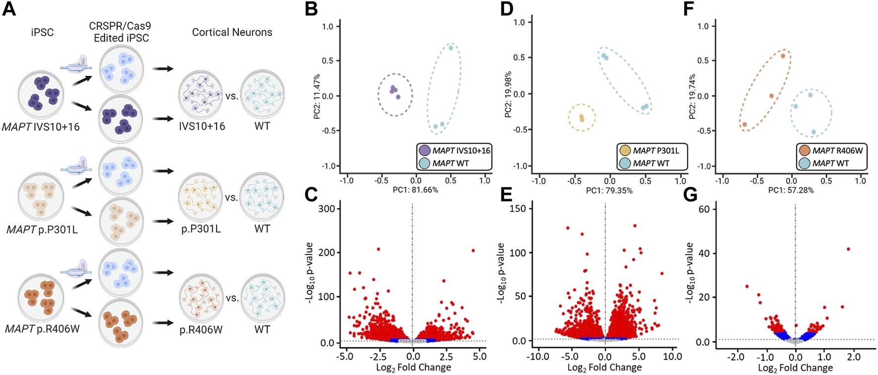 FIGURE 2. Global transcriptomic effects of MAPT IVS10 + 16, p.P301L, and p.R406W mutations. (A) Overview of iPSC differentiation into cortical neurons. (B–C) Principal component analyses and volcano plots obtained from MAPT IVS10 + 16 neurons compared to isogenic controls. (D–E) PCA and Volcano plots obtained from MAPT p.P301L neurons compared to isogenic controls. (F–G) PCA and Volcano plots obtained from MAPT p.R406W neurons compared to isogenic controls. PCA and Volcano plots were based on 19,957 protein-coding genes using regularized-logarithm transformation (rlog) counts. Volcano plots showing log2fold change between iPSC-derived neurons carrying MAPT mutations vs. isogenic controls, and the –log10 p-value for each gene. Red and blue dots within volcano plots represent, respectively, genes differentially expressed under adjusted-BY (BY-FDR) and unadjusted p-values (p ≤ 0.05).