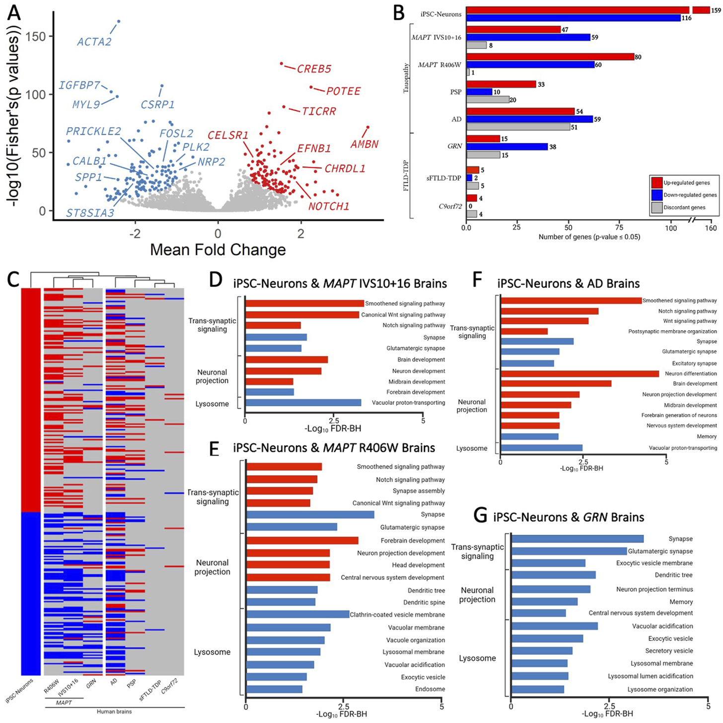 FIGURE 5. Genes changed in iPSC-neurons from MAPT mutations are also altered in brains from tauopathy patients. (A) Meta-Volcano plot identifies the common gene expression changes by MAPT IVS10 + 16, p.P301L and p.R406W. Red and blue dots represent up- and down-regulated genes, respectively. (B) Bar graph of the number of genes differentially expressed in iPSC-neurons from MAPT mutations (n = 275) and differentially expressed in brains from tauopathy patients (MAPT IVS10 + 16 and p.R406W carriers, PSP, and AD) and from FTLD-TDP (GRN mutation carriers, sporadic FTLD-TDP (sFTLD-TDP), and C9ORF72 expansion carriers). Up-regulated genes, red. Down-regulated genes, blue. Discordant genes (defined as p <0.05 and logFold change opposite of iPSC-neurons), gray. (C) Heatmap of gene expression of 275 genes in iPSC-neurons and human brains with hierarchical clustering revealing relatedness of cohorts. (D–F). Bar graphs showing the most significant pathways enriched shared between the iPSC-neurons and (D) MAPT IVS10 + 16 brains; (E) MAPT p.R406W brains; (F) sporadic AD brains; (G) GRN mutation carrier brains. Pathways from up-regulated genes (red); pathways from down-regulated genes (blue).