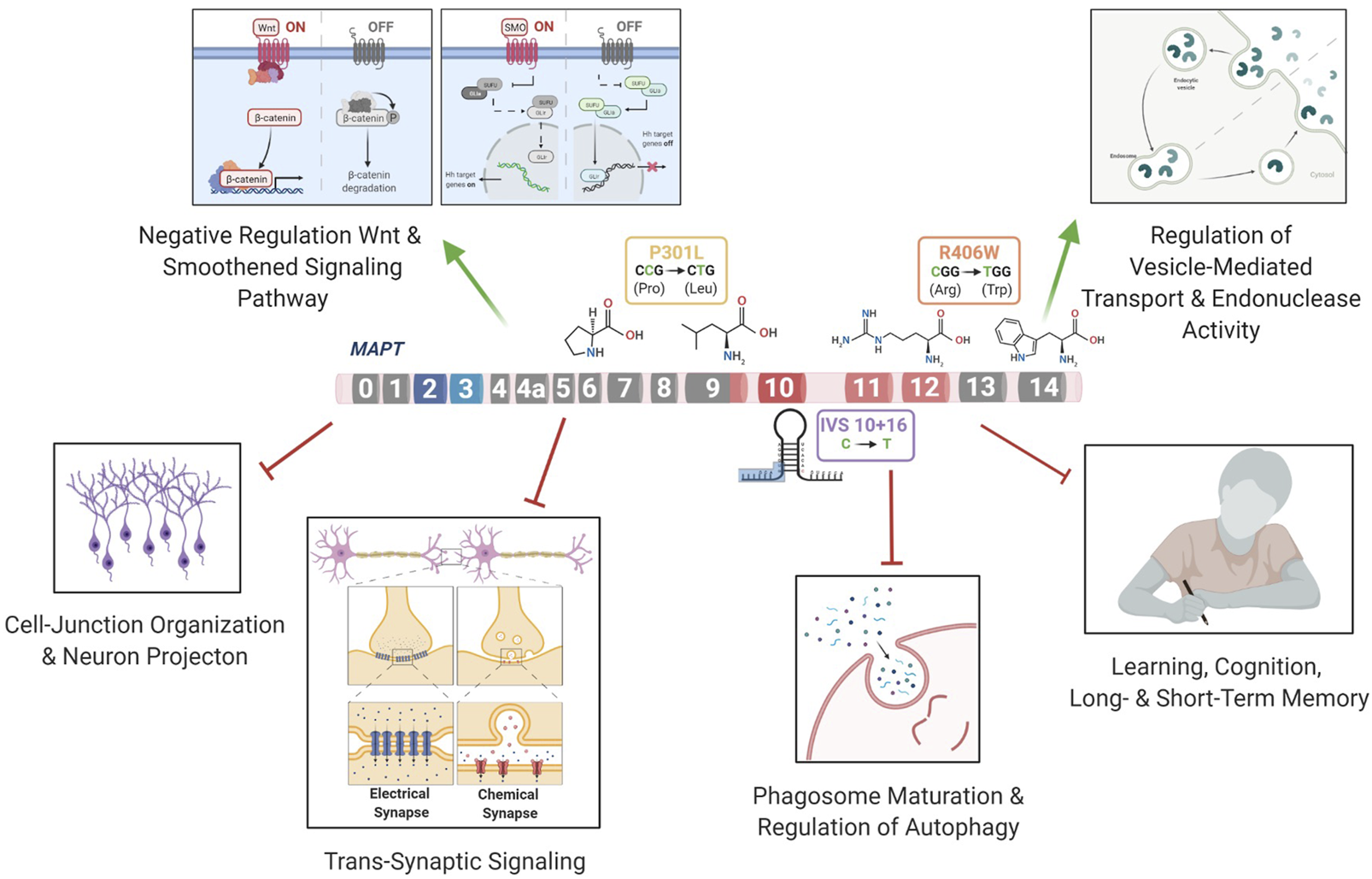 The three mutations located in distinct regions of the MAPT gene produced a common molecular signature of genes that were enriched for pathways involved in trans-synaptic signaling, neuronal projection and lysosomal regulation. Several pathways were related to functional changes described in FTLD. Wnt signaling has been previously shown to be associated with the MAPT IVS10 + 16 mutation (Harrison-Uy and Pleasure, 2012) and linked to several neurodegenerative disorders such as AD and FTLD (Korade and Mirnics, 2011; Rosen et al., 2011; Riise et al., 2015; Verheyen et al., 2018; Bottero et al., 2021). In addition, Notch signaling has been shown to be related to the microtubule stability within neurons (Bonini et al., 2013). The Ras signaling regulates basic cellular processes in the construction of neuronal networks, including neurogenesis, vesicular trafficking, or synaptic plasticity (Johnson and Chen, 2012; Qu et al., 2019). The synapse assembly has been associated with Alzheimer’s-type dementia (Clare et al., 2010). Anterograde trans-synaptic signaling; regulation of synaptic; and long-term synaptic potentiation have all been implicated in tauopathies (Purves et al., 2001; Gómez-Palacio-Schjetnan and Escobar, 2013; Liou et al., 2019). Additionally, several genes were enriched for pathways related to the loss of learning or memory and cognition (Rabinovici and Miller, 2010; Bott et al., 2014). Finally, we found that genes associated with dysregulation of the vesicle transport along microtubule pathway; phagosome maturation and autophagy were significantly reduced. This finding is consistent with a recent study of MAPT p.V337M-expressing cerebral organoids, where mutant organoids exhibited failure of protein homeostasis, a disruption of autophagy function, and loss of glutamatergic neurons (Bowles et al., 2021). Defects in endolysosomal pathways have been implicated in reduced clearance of protein and cell debris, which may contribute to neurodegeneration (Liu et al., 2012; Viegas et al., 2012; Gunawardena et al., 2014; Etchegaray et al., 2016; Kulkarni and Maday, 2018; Xu et al., 2021c). Thus, here, we identify a series of pathways that are common across different MAPT mutation types, suggesting that stem cell models capture defects observed in FTLD-Tau patients (Figure 6).