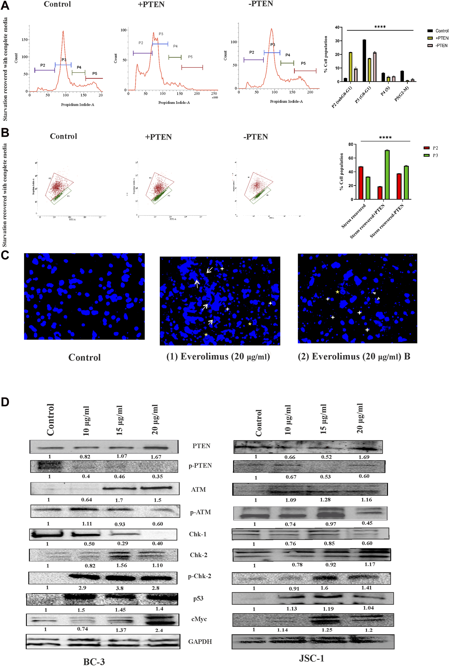 Regulatory death axis of mTOR inhibitors through PTEN in KSHV-infected cells. (A) Alterations in cell cycle phases with PTEN transfected and silenced conditions in comparison with non-transfected conditions in the serum stress-induced in vitro model. (B) Changeover in mitochondrial membrane potential in PTEN transfected and silenced conditions compared to non-transfected control. (C) Microscopic images analyzing DNA damage activity by DAPI staining post mTOR inhibitor treatment. Two different everolimus (20 μg/mL) that are treated, Figures 1, 2, have been represented to showcase various types of DNA damaging alterations. White arrows represent the ruptured fragmented nucleus; white asterisks indicate micronuclei; yellow asterisks show herniated nuclei; and white triangles indicate blebbing with invagination. (D) Western blot images for different PTEN-mediated downstream stress-induced programmed cell death indication proteins, with their normalized value at different doses of mTOR inhibitor treatment against two different KSHV-infected cell lines. The reference gene expression of GAPDH has been used as loading control and utilized for all the other respective gene expression in each set.