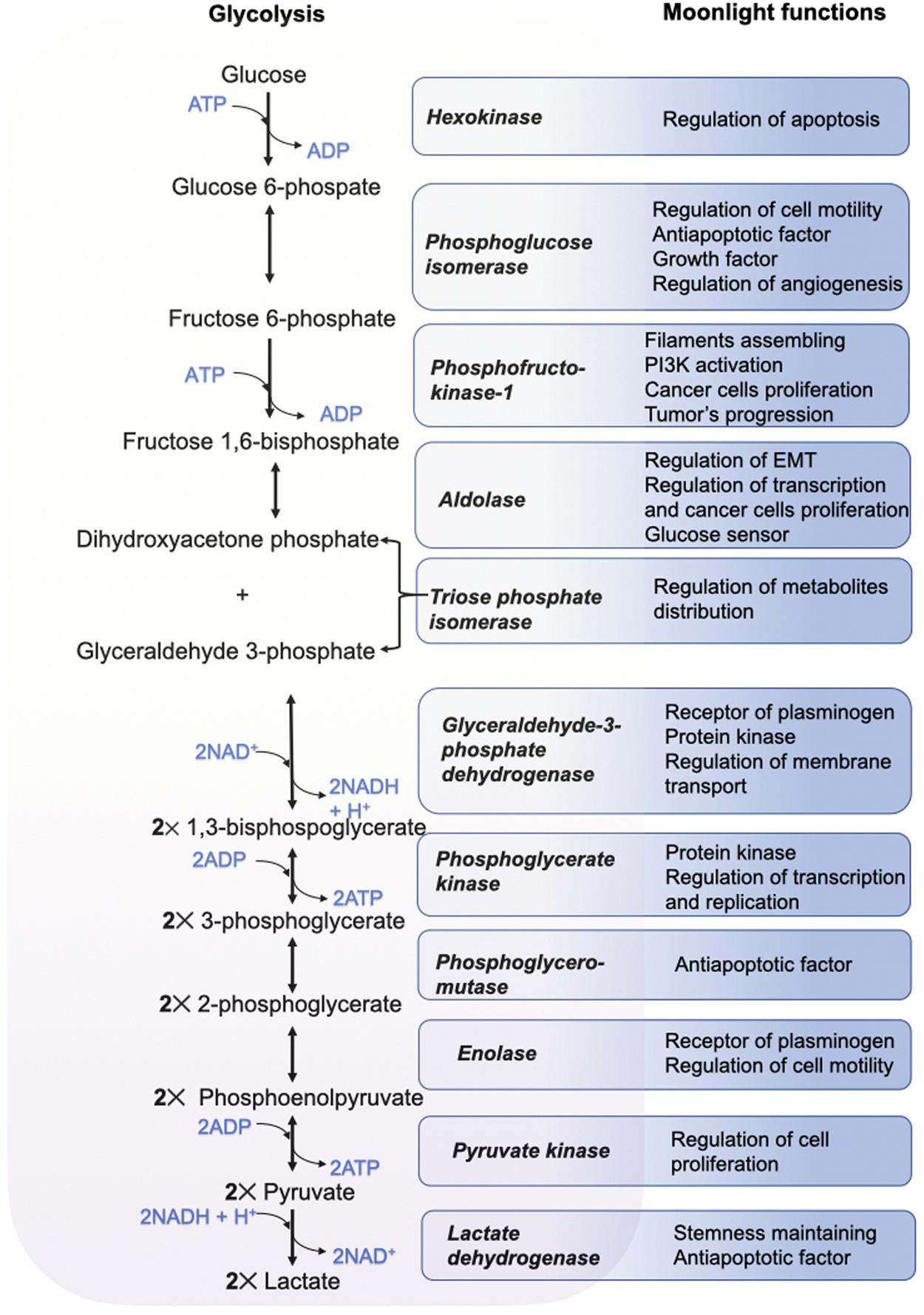 FIGURE 2. Some moonlight functions of glycolytic enzymes important for malignant transformation and tumor progression.