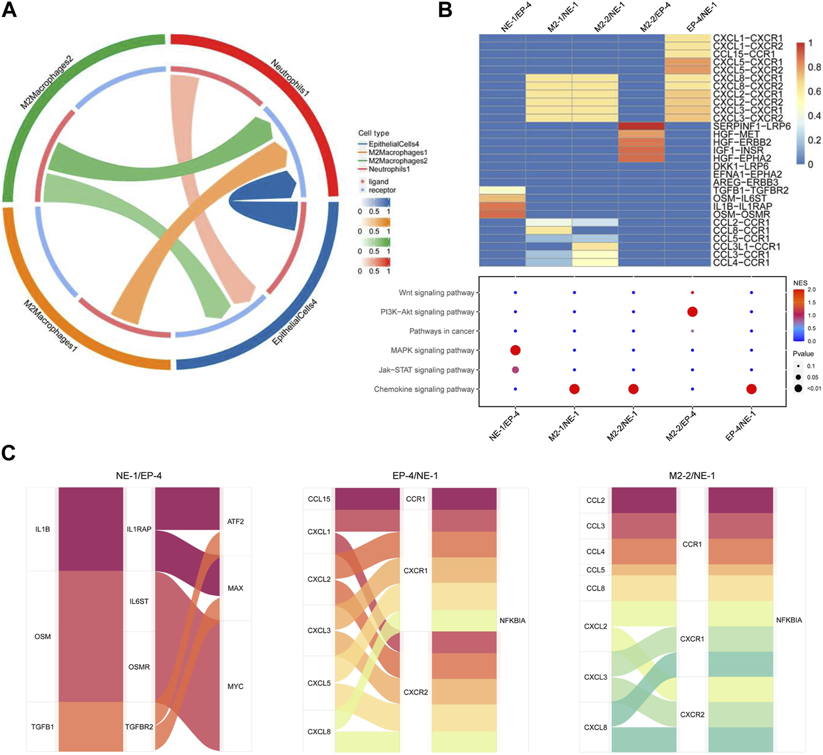 Cellular interaction analysis among neutrophils, malignant epithelial cells, and M2 macrophages. (A) Cell network of NE-1, EP-4, M2-1, and M2-2 was analyzed using CellCall; (B) heatmap of ligand–receptor interactions among NE-1, EP-4, M2-1, and M2-2. Signaling pathways involved in ligand–receptor interactions were analyzed KEGG enrichment analysis; (C) Sankey diagram displayed transcript factors downstream of the signaling pathway.