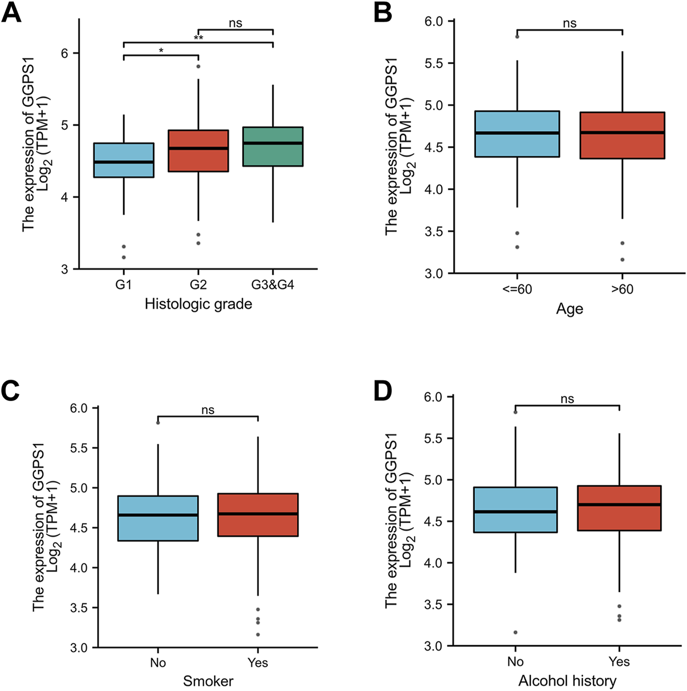 The associations between expressions of GGPS1 and clinical characteristics. (A) Histological grade. (B) Age. (C) Smoker. (D) Alcohol history. (ns, no statistically difference; *, p < 0.05; **, p < 0.01)