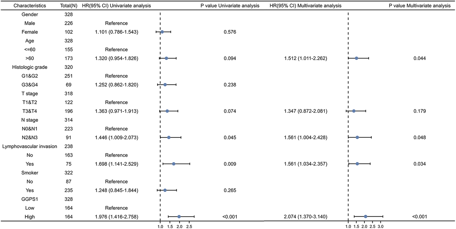 The role of univariate and multivariate Cox regression was assessing whether gender, age, TNM stage, the expression of GGPS1and so on were independent prognostic factors for the survival of OSCC patients. This study calculated hazard ratios (HR) and 95% confidence intervals (CI), and the significance threshold was set at p < 0.05. R package (survival, version 3.2.10) was a procedure of data processing. HR > 1 indicates disadvantageous factors.