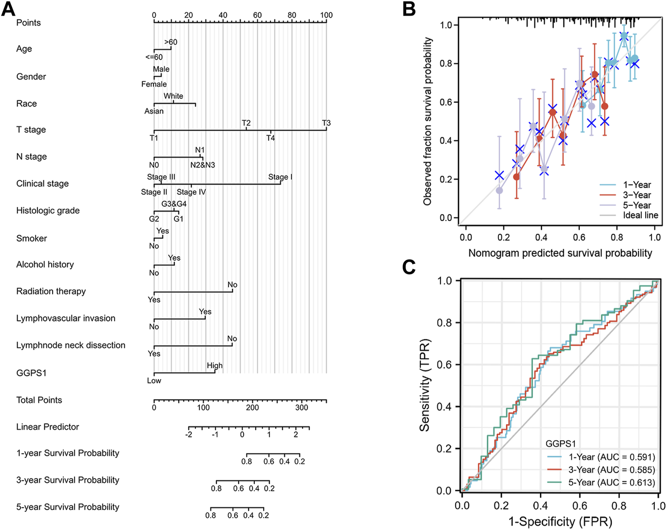 Diagnostic value of GGPS1 in OSCC. (A) The nomogram combining GGPS1 expression with key clinical characteristics. (B) The calibration plot of the nomogram for predicting 1-,3-and 5-year overall survival probability. (C) The diagnostic value of GGPS1 mRNA expression.