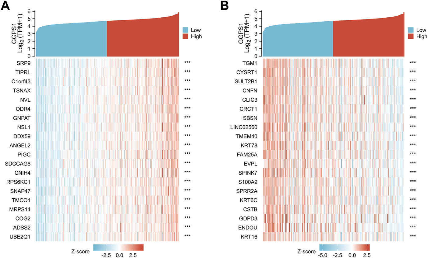 GGPS1 (geranylgeranyl diphosphate synthase 1) is a member of the prenyltransferase family and encodes a protein with geranylgeranyl diphosphate (GGPP) synthase activity. Abnormal expression of GGPS1 can disrupt the balance between protein farnesylation and geranylgeranylation, and result in a variety of cellular physiologic and pathological processes, thereby affecting inflammation and organ damage (Xu et al., 2015). The researches of GGPS1 on the functions and the relationship between diseases and GGPS1 involve an extremely extensive range. GGPS1-knockout plays a part in restraining ventilator-induced lung injury and attenuating sepsis-induced acute lung injury (Li et al., 2021; Wang et al., 2022). In Perrault syndrome and A typical femur fractures, GGPS1 may be one of the genetic factors (Foley et al., 2020; Zhou et al., 2021; Faridi et al., 2022). GGPS1 deficiency could result in dystocia by disrupting uterine contraction (Sang et al., 2021). In liver diseases, GGPS1 is critical for modulating acute obstructive cholestatic liver injury and can serve as a biomarker in Hepatocellular carcinoma (Yu et al., 2014; Jia et al., 2020). In lung adenocarcinoma, the overexpression of GGPS1 contributes to tumor metastasis and is correlated with poor prognosis (Wang et al., 2018). Besides, it has been proved that the expression of GGPS1 participated in and affected the treatment of two anticancer drugs for OSCC (Xu et al., 2021). But the concrete characters of GGPS1 in OSCC remain unclear.