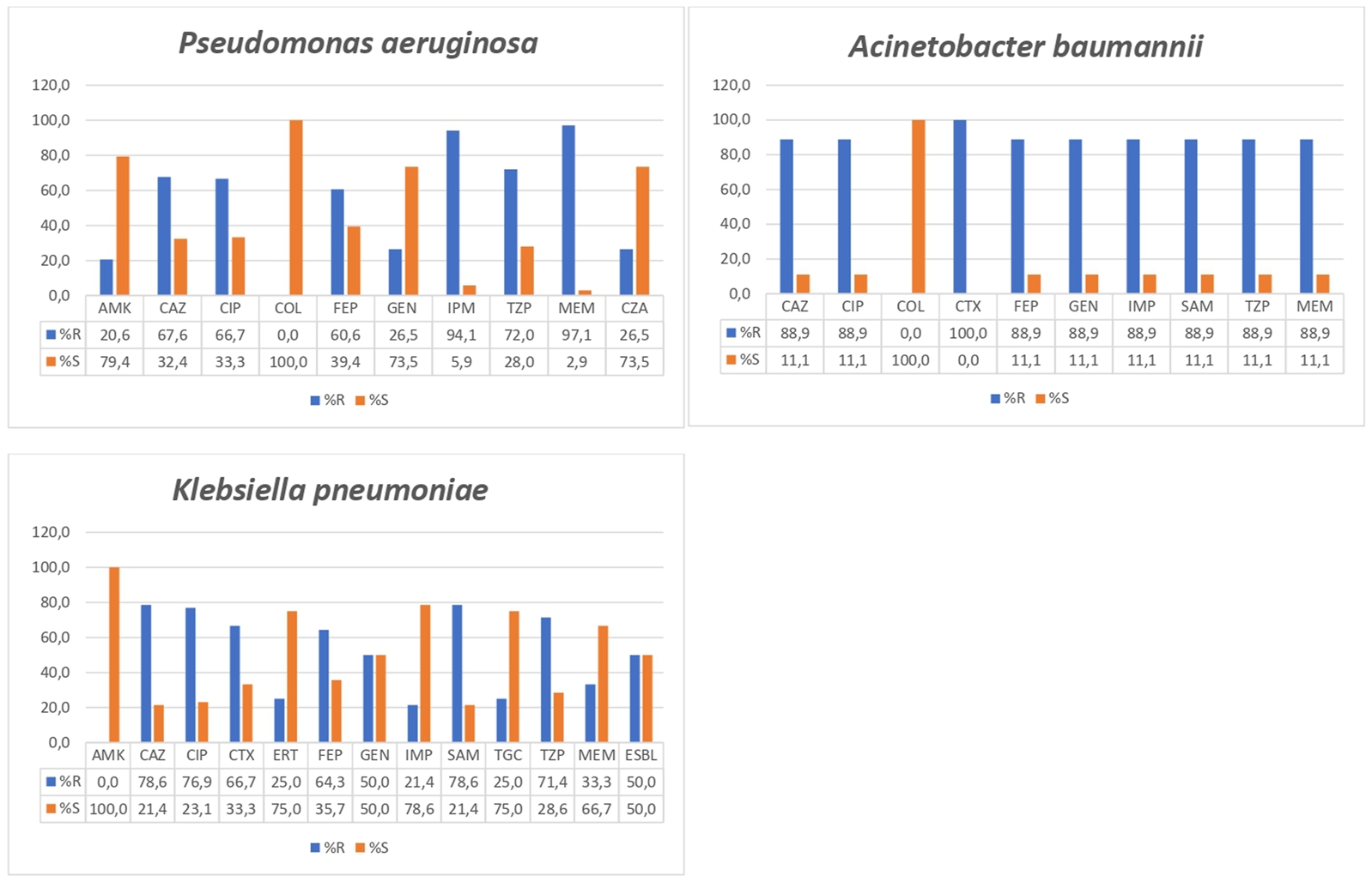 Antimicrobial resistance levels in Pseudomonas aeruginosa, Acinetobacter baumannii, and Klebsiella pneumoniae. CTX, cefotaxime; CAZ, ceftazidime; FEP, cefepime; SAM, ampicillin plus sulbactam; TZP, piperacillin plus tazobactam; IMP, imipenem; MEM, meropenem; ERT, ertapenem; GEN, gentamicin; AMK, amikacin; CIP, ciprofloxacin; TGC, tigecycline; COL, colistin; ESBL, extended spectrum β-lactamases.