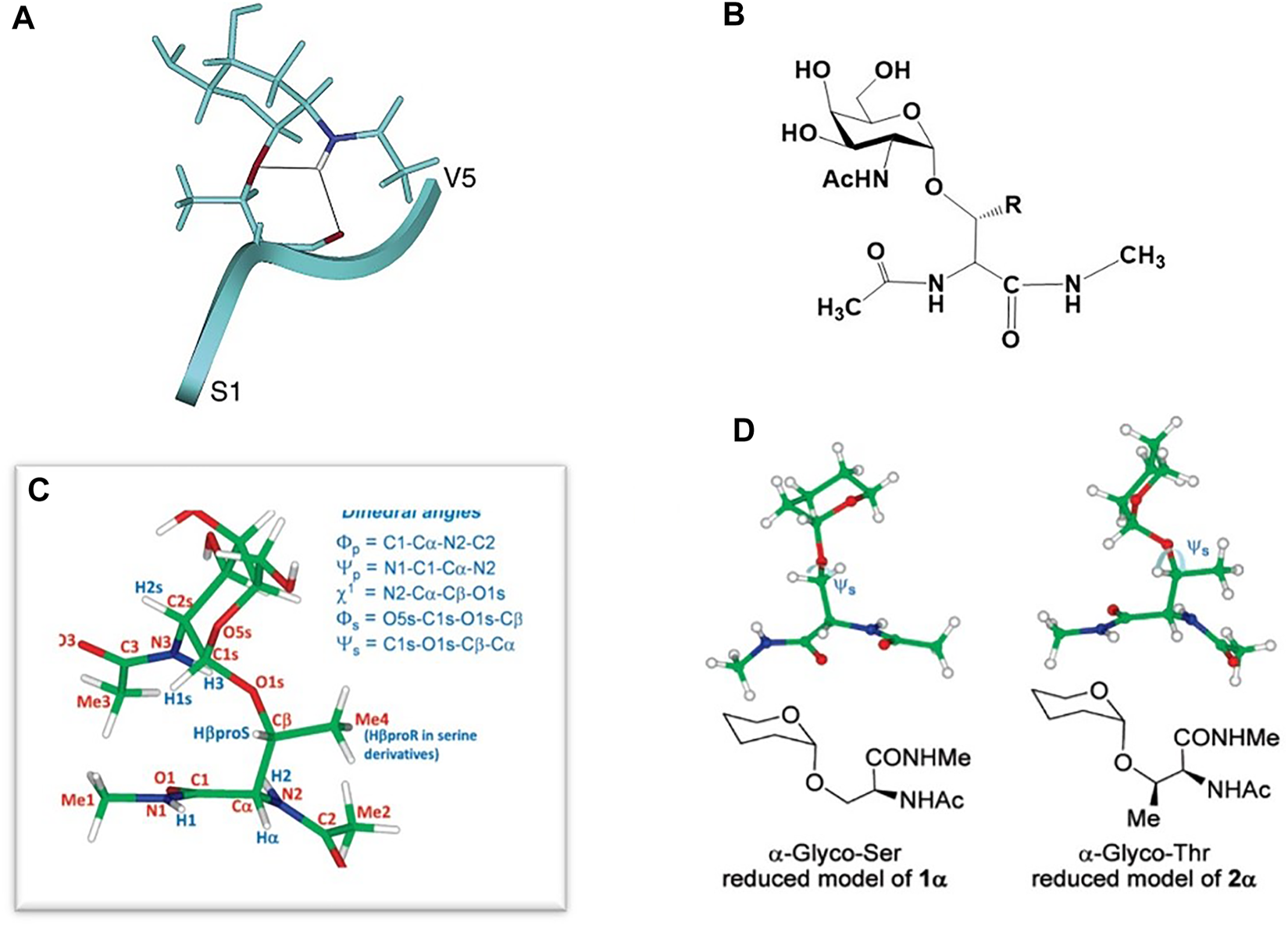 (A) Peptide-GalNAc interactions of one of the penta-glycopeptides studied in (Coltart et al., 2002). (B) Structure of the small glycopeptide studied in (Corzana et al., 2007). (C) Definition of the dihedral angles of the molecule in (B). (D) Disposition of the sugar relative to the amino acid backbone in the Ser (left) and Thr (right) models of the molecule in (B).