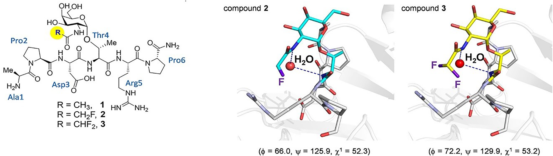 In the past decade, many reports have further corroborated the importance of the Thr methyl group in biological recognition and activity. In 2009, Corzana and coworkers extended their structural analysis to dipeptides with a saccharide on either a Ser or Thr in Ser-Thr dipeptide pairs and saw similar organization in the Thr glycoamino acids when comparing side-by-side glycosylated sites. (Corzana et al., 2009). Since these Ser-Thr groupings are often present in mucin peptide repeats that are used in anticancer vaccine design, the conclusion was that the conformational preference will be important in the interaction of theses motifs with the human immune system. This postulate was borne out in subsequent studies that show specific interaction of MUC1 glycopeptides with antibodies that are raised to these antigens. (Martinez-Saez et al., 2015). SM3 is a monoclonal (mAb) antibody raised to a mucin from skim milk that had been stripped of many of its covalently attached glycans. (Burchell et al., 1987). SM3 has been shown to bind to MUC1 glycopeptides containing a GalNAc in the principle immunodominant sequence of Pro-Asp-Thr*-Arg (where the asterisk represents glycosylation with GalNAc). Using synthetic peptides with either the wild type Thr or a Ser substitution, (where both were either glycosylated or “naked”), an intriguing study showed that the nature of the GalNAc determinant is important for antibody recognition. The Thr-linked GalNAc tandem repeat peptide binds SM3 much more strongly than the Ser-linked analogue in Biolayer Interferometry (BLI) experiments. Smaller models of these glycopeptides were used to solve crystals structures of both the Thr and Ser-linked Tn structures. It was found that the Ser analogue adopts a high energy conformation about the glycosidic linkage in the crystal structure that is populated about 20% free in solution. These phi/psi angles are disallowed by the presence of the ß-methyl group in the Thr analogue. It was concluded that the nature of the aglycone dictates the organization of conformation around the glycosylation site. In 2018, a follow up to this work set out to prove that the bridging water molecules in the simulations described in the previous section were actually responsible for the different conformational preferences in Tn-Thr vs. Tn-Ser residues. (Bermejo et al., 2018). This was shown by solving the crystal structure of SM3 bound to a small Tn-Thr glycopeptide model that contained an N-monofluoro or difluoroacetyl groups on the GalNAc nitrogen in an effort to enhance potential interatomic hydrogen bonds that could mediate a bridging water structure. The results did show that in the fluorinated molecules, the bridging water molecule could be visualized for the first time (Figure 5.)