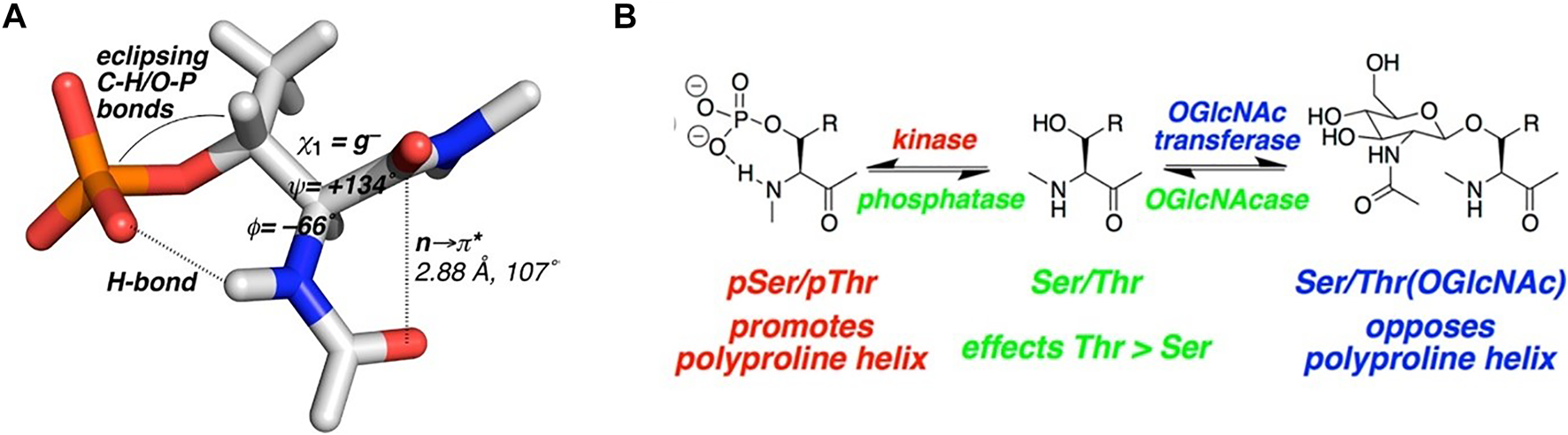 Work by Zondlo and co-workers showed some interesting findings regarding the effects of phosphorylation and O-GlcNAc modifications in model peptides. Their work initially concentrated on tau, a natively disordered protein that, when functioning normally is a component of microtubule scaffolding. Hyperphosphorylation of tau, however, promotes aggregation and formation of neurofibrillary tangles in many neurodegenerative diseases, including Alzheimer’s disease. Thus, tau is one of the entities responsible for the pathology of these disease. Since the pathological effects of tau are only evident after it is post-translationally modified, much of this group’s work concentrated on defining the effect of the phosphate (or GlcNAc) on the structure and conformation of both the modified Ser or Thr residue, and the surrounding sequence, in a series of model peptides from the tubulin-binding domain of tau. Phosphorylation of this domain is responsible for the aggregative and fibril-forming properties of the protein. Their first study showed that phosphorylation of peptides derived from the proline rich domain of tau nucleate the formation of a polyproline-II type helical structure in these sequences. (Bielska and Zondlo, 2006). While many previous studies showed phosphorylation-induced structural changes in peptides, many of those results showed more of an ordered-to-disordered transition, e.g., loss of helical content upon modification. (Johnson and Lewis, 2001; Andrew et al., 2002). A follow up study in 2014 looked more deeply into the effects of PTMs on Ser/Thr residues where they defined a specific “structure” of a phosphothreonine residue compared to that of a phosphoserine residue. (Brister et al., 2014). In this study, they showed a particular “conformational order” induced by a phosphothreonine that was not the same as a phosphoserine. Specifically, phosphothreonine residues, on average, were responsible for much greater structural adjustments in the model peptides than phosphoserine residues. This was observed mostly through changes in NMR data (coupling constants, induction of chemical shift changes, and amide H-bonding/temperature coefficients). Like other effects of mucin-type glycosylation, phosphorylated threonine residues were more structured and caused more conformational restriction than phosphoserine residues. Figure 6 shows the proposed structure of the phosphothreonine residue as determined by NMR. O-GlcNAc and phosphorylation seemed to have opposing roles, with phosphorylation, but not GlcNAcylation, promoting a PPII helix structure. The fact that many Ser/Thr sites compete for phosphorylation and O-GlcNAc modifications suggests that phosphate-induced conformational changes that lead to neurofibrillary tangles and the pathological effects in neurodegenerative disease are nullified with the presence of O-GlcNAc at those same sites. Inhibitors of the O-Glycanase that removes O-GlcNAc from Ser/Thr residues are being tested as therapeutic agents against neurodegenerative diseases. (Yuzwa et al., 2008; Yu et al., 2012; Yuzwa et al., 2012; Wang et al., 2020; Alteen et al., 2021).