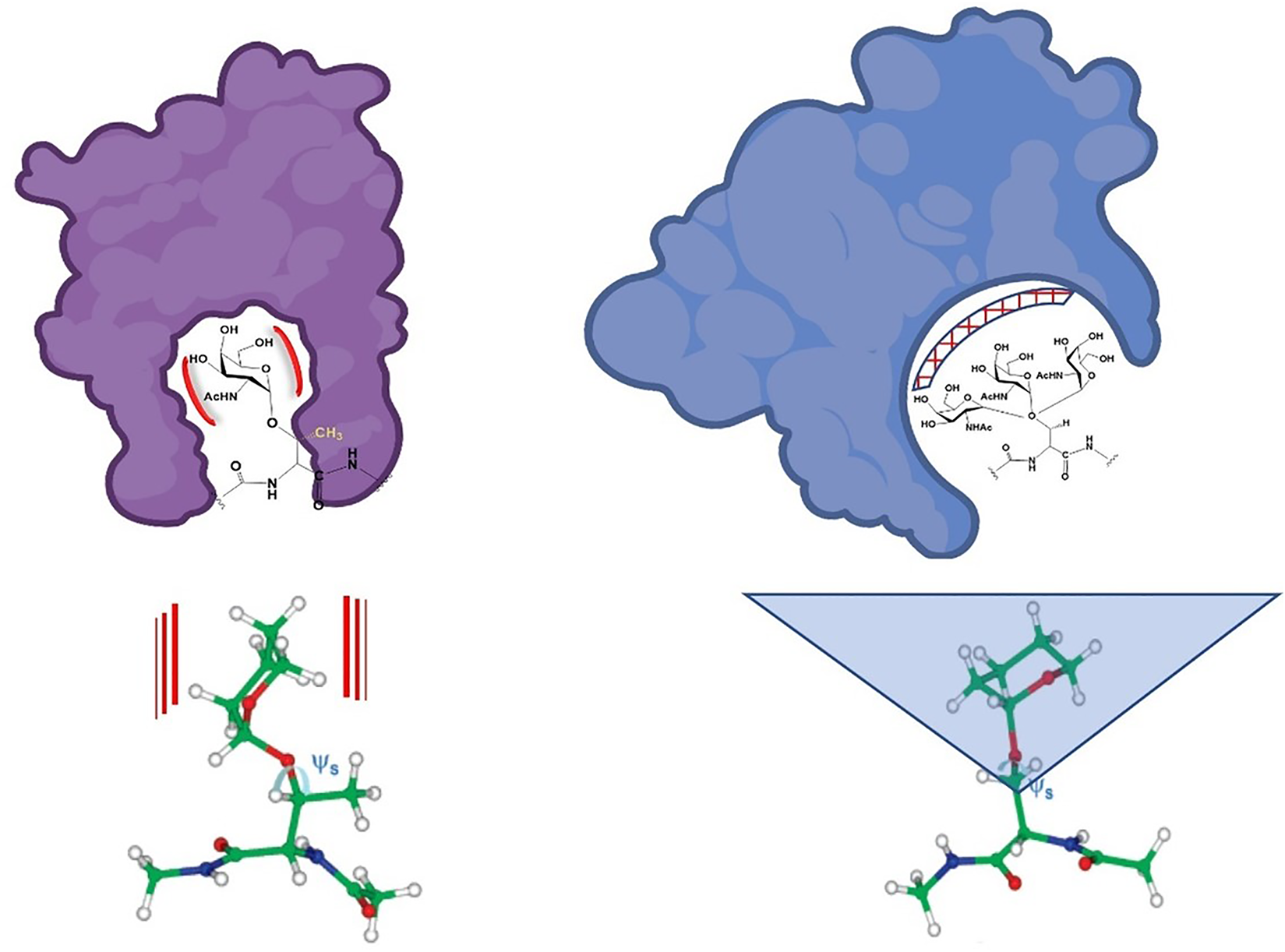 Schematic approximation of potentially “natural” binding modes of Ser and Thr-linked O-glycopeptides. The limited conformational space swept by the Thr analogues are shown on the left and the more flexible Ser conformational space is shown on the right. The calculated structures from reference (Gerken et al., 2013) are shown below. Red lines and blue triangle represent rigidity (Thr glycoamino acid) and flexibility (Ser glycoamino acid).