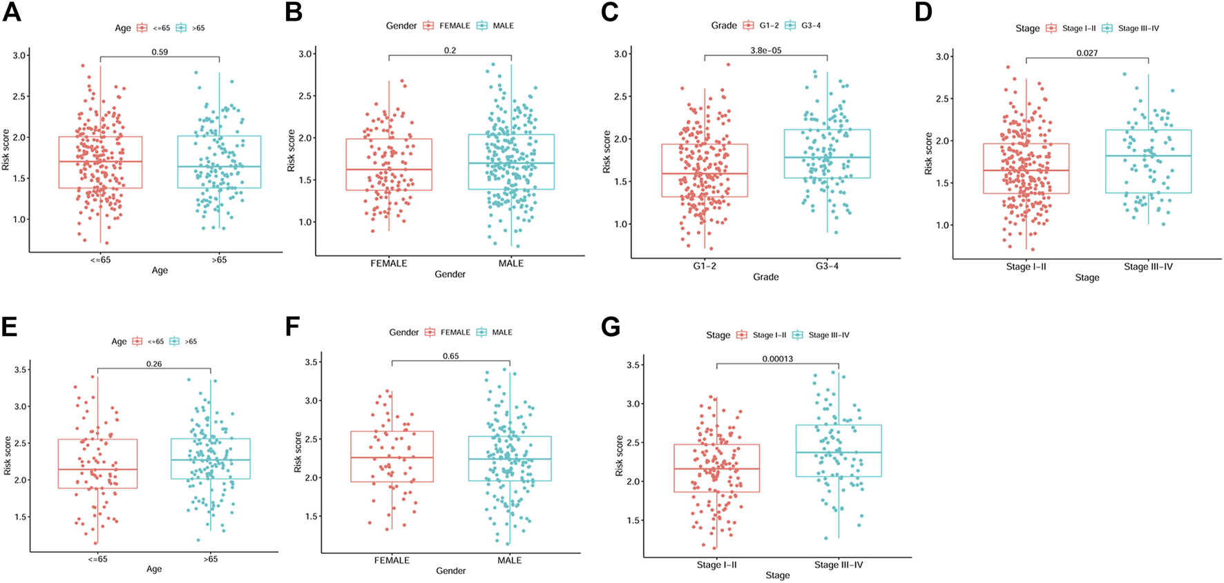 Box plots showing the correlations between risk score and clinicopathological factors. (A–D) Age, gender, grade and stage from TCGA dataset. (E–G) Age, gender and stage from ICGC dataset.