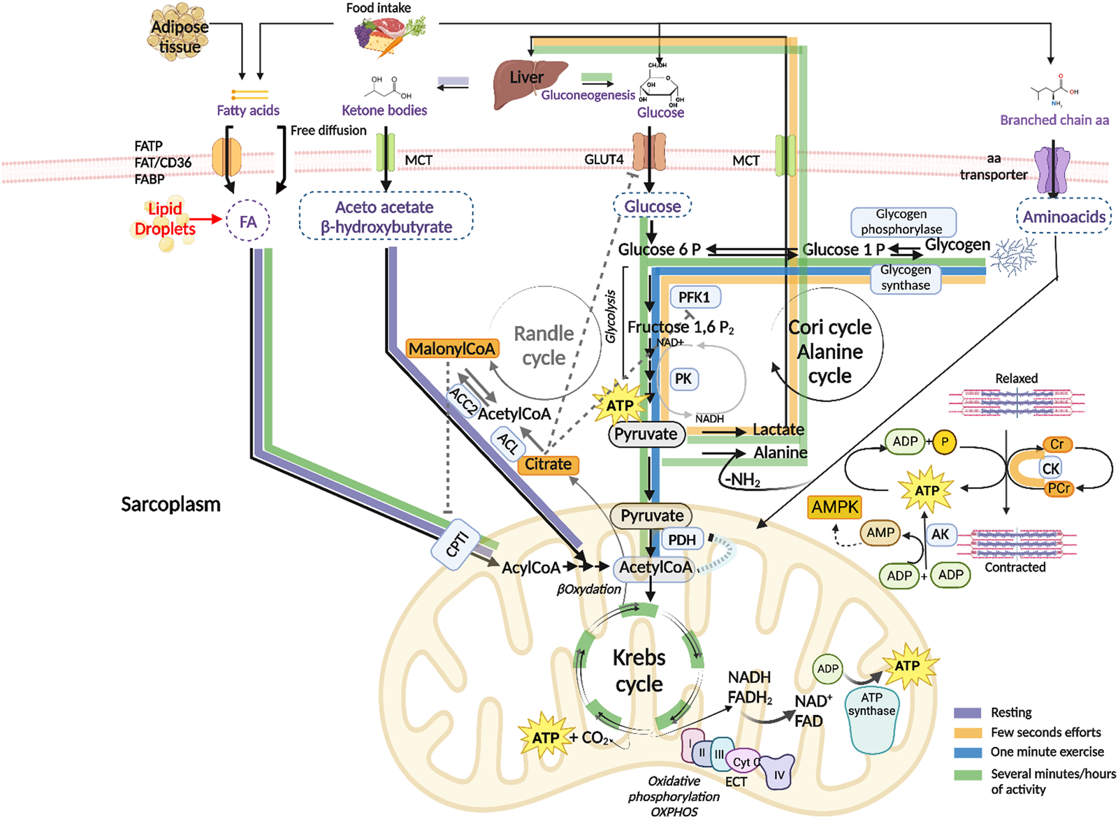 Schematic presentation of the energy substrates used by skeletal muscle to produce adenosine triphosphate (ATP) under different conditions. ATP hydrolysis to Adenosine diphosphate (ADP) and phosphate (P), catalyzed by myosin ATPase, provides the energy necessary for skeletal muscle contraction Purple arrows: the main energy sources used by resting muscle are fatty acids from adipose tissue and ketone bodies from liver. After passing the sarcolemma, fatty acids enter the mitochondria where they are degraded to acetyl CoA (βoxidation) and completely oxidized to carbon dioxide in the Krebs cycle which generates ATP and the reduced forms of the nicotinamide adenine dinucleotide (NAD) and flavin adenine dinucleotide (FAD) cofactors. NADH and FADH2 oxidation by the electron transport chain (ETC.) is coupled to ATP synthesis (oxidative phosphorylation, OXPHOS). Glucose is used to replenish the glycogen stores by glycogen synthase. Fatty acid–binding protein (FABP), fatty acids transport proteins (FATPs), fatty acids translocase (FAT/CD36), monocarboxylate transporters (MCTs), carnitine palmitoyltransferase I (CPTI). Orange arrows: in the very early seconds of activity, degradation of phosphocreatine (PCr) by creatine kinase (CK) releases free Cr and P, which is transferred to ADP to regenerate ATP. The adenylate kinase (AK) enzyme catalyzes the formation of ATP and Adenosine monophosphate (AMP) from two ADP molecules. AMP activates the AMP kinase (AMPK), a key sensor of the energy level the cell. ATP is also generated by anaerobic glycolysis, where glucose-6-phosphate derived from muscle glycogen (by means of glycogen phosphorylase) is catabolized to pyruvate by glycolytic enzymes including phosphofructokinase 1 (PFK1) and pyruvate kinase (PK), which is reduced to lactate. Lactate is released into the circulation and taken up by the liver for the synthesis of glucose through gluconeogenesis (Cori cycle). Blue arrows: when high power exercise lasts beyond one minute, ATP is mainly generated by oxidative metabolism of glycogen-derived glucose. Pyruvate is transported to the mitochondrion and transformed into acetyl CoA by the pyruvate dehydrogenase (PDH) complex and enters the Krebs cycle. Green arrows: in case of prolonged exercise, ATP is generated by the oxidative metabolism of both carbohydrates and fatty acids from endogenous and exogenous stores. Branched-chain amino acids are transformed into ketoacids by a specific transaminase. The ammonia group is transferred to pyruvate generating alanine which is transported to the liver and used as a gluconeogenetic precursor (alanine cycle). Randle cycle: allosteric mechanisms underlying fuel selection for ATP supply by skeletal muscle involve acetyl CoA, Citrate and malonyl CoA, they are indicated by dashed grey inhibitory lines and grey arrows. ATP citrate lyase (ACL), acetylCoA carboxylase 2 (ACC2). Created with BioRender.com.