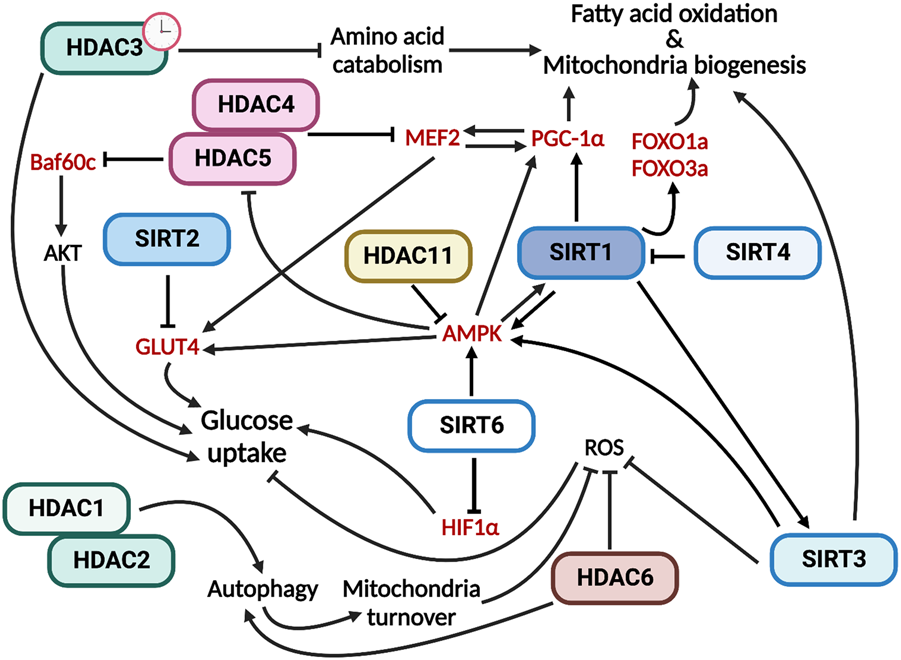 HDACs regulate muscle metabolism, targeting many metabolic enzymes (Guan and Xiong, 2011) and more than 20% of mitochondria proteins (Choudhary et al., 2009). Most HDAC functions in skeletal muscles have been identified by genetic tools, in vitro and in vivo. Not all members of the HDAC superfamily play a role or have been studied in skeletal muscle metabolism; below we review only the ones whose functions have been elucidated.