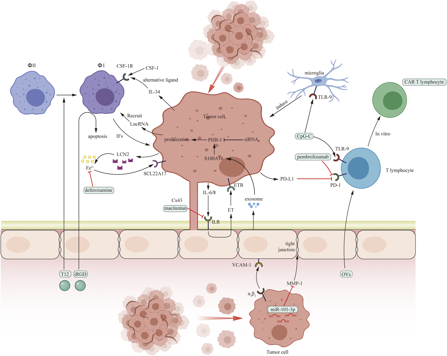 Tian Zhang et al. designed a nanoparticle, iRGD-terpolymer-lipid hybrid nanoparticle with coloaded doxorubicin and mitomycin c (iRGD-DMTPLN), with an iRGD signal molecule iRGD on it, which targets endothelial and BrM cells as well as TAMs. After interacting with endothelial cells, the particle can be endocytosed by the cells, transferred from peripheral circulation to the brain microenvironment, and then be endocytosed by TAMs and tumor cells, releasing the contained drug. This nanoparticle effectively reduces metastases burden and TAMs, significantly restoring the brain microenvironment (Zhang et al., 2019).