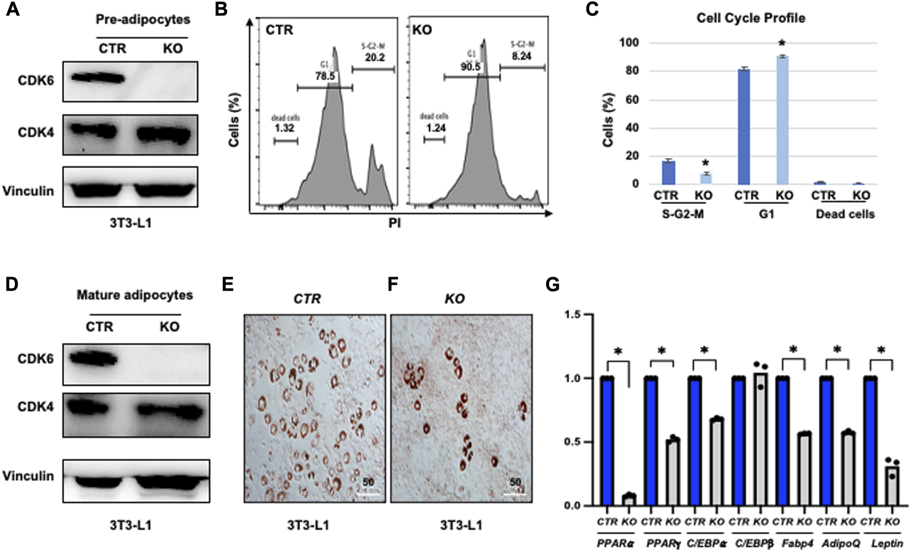 FIGURE 5. Knock-down of CDK6 in 3T3-L1 cells copied the defect of K43M in differentiation. (A, D) Immunoblots of the protein levels of CDK6 and CDK4 in pre-adipocytes (A) and differentiated cells (D) of control (CTR) and KO cells. Vinculin was used as loading control. (B) Representative flow cytometric cell cycle profiles of PI+ pre-adipocytes. (C) Histograms summarizing the cell cycle distribution of the cells in (B). Data shown are mean ± s.e. (n = 3); *p <0.05 vs CTR, T-test. (E, F) Representative images of Oil Red O staining of differentiated cells from CTR (E) or KO (F) cells in the presence of WAT inducers for 7 days. (G) qRT-PCR analyses for expression levels of WAT-associated transcriptional factor and WAT-related genes. Data shown are mean ± SE (n = 3). *, p < 0.05, T-test, significantly different from the CTR.