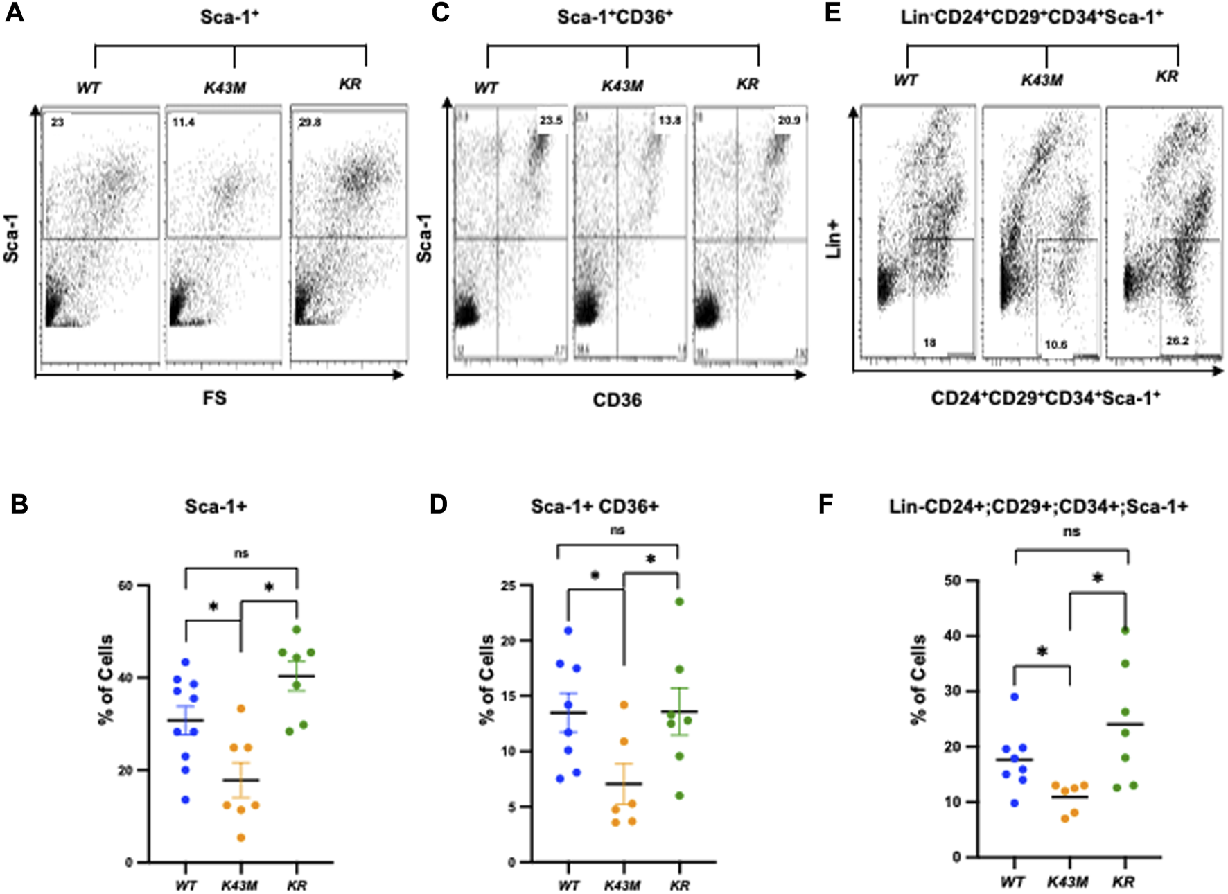Reduced adipocyte precursors in K43M mice and increased adipocyte precursors in R31C mice. (A, C, E) Representative flow cytometric profiles of Sca-1+(A), Sca-1+CD36+(C), and Lin−Sca-1+CD24+CD29+CD34+(E) cells isolated from eWAT of WT, K43M, and R31C mice at 18–20 weeks of age. (B, D, F) Histograms summarizing the Sca-1+(B), Sca-1+CD36+(D), and Lin−Sca-1+CD24+CD29+CD34+(F) cells in panel (A, C, E), respectively. For (B, D, F), data shown are mean ± SE (n = 6–10). *p < 0.05, t-test. For B, p-value < 0.0001, one way ANOVA, for D, p-value < 0.0001, one way ANOVA, and for F, p-value = 0.0008, one way ANOVA.