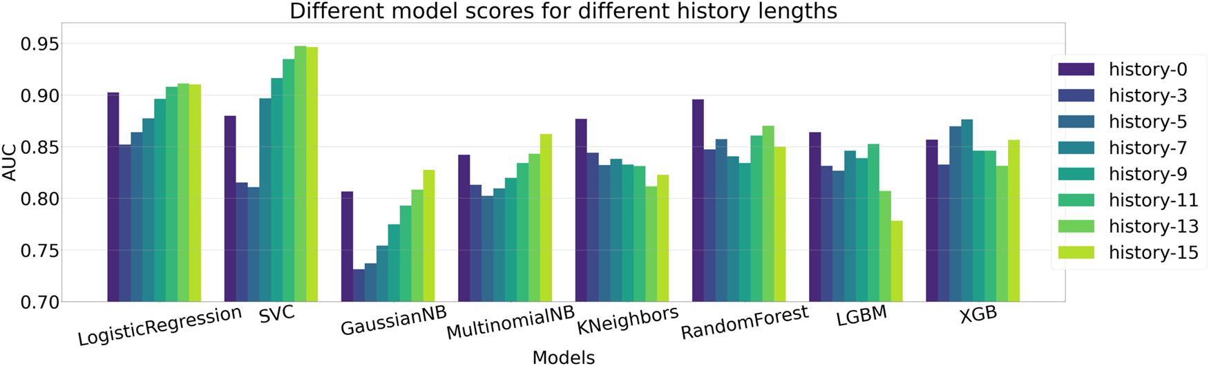 Comparison of AUC scores between different ML methods. Logistic Regression, SVC, GaussianNB, MultinomialNB and XGB show gradual improvement over their baseline score when history is introduced. Here SVC scores the most with an AUC of 94.74% in the history-13 setting.