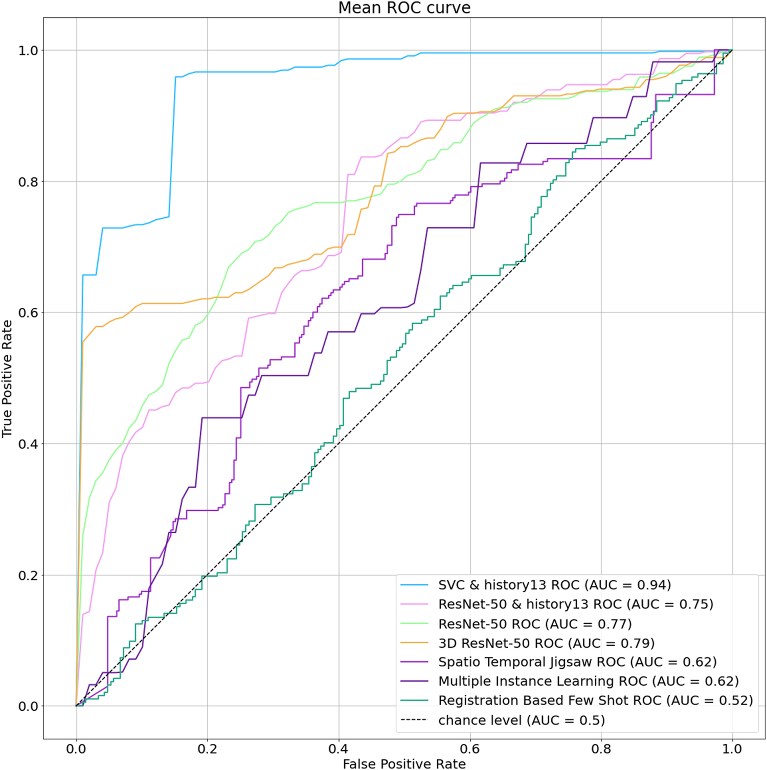 Our developed methodology beat all the experiments by a large margin. The 3D Resnet model performs the best among all the deep learning methods with an AUC score of 79.55% and an EER of 25.26%. On the other hand, our method has an AUC of 94.74% and an EER of 6.06% which is a 19% AUC and 76% EER improvement. Thus, our developed method provides the most reliable outputs among all the existing methodologies. A comparison between the stated methods with our developed method is presented in Table 4. Additionally, the ROC Curve comparison between the methods is shown graphically in Figure 7.