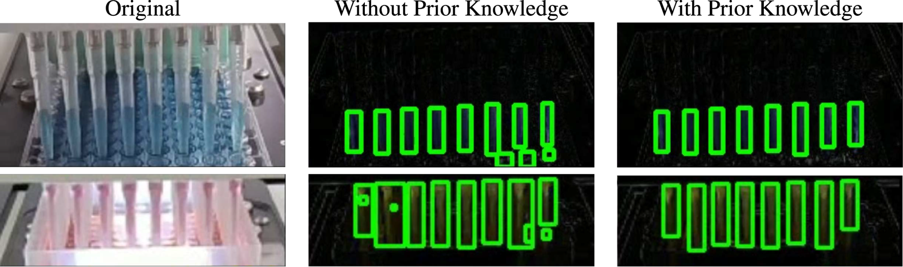 Most of the noise and artifacts from Δp are stripped away after applying the opening morphological operation. Then contours are detected from the cleaned RoI which point to the boundary of each liquid movement. This process is showcased in Figure 4. The size of the contours is supposed to increase on the y-axis if the pipettes are working correctly and the liquid is being successfully extracted. These contours are further filtered using prior knowledge about the environment and RoI. Firstly, the number of pipettes, n(p) is known beforehand, and thus the total number of contours should be the same. The detected contours are sorted by area and the largest n(p) contours are further processed. Secondly, each contour must have a minimum height to width ratio as its shape must conform to that of the pipette. Thirdly, these contours must always have vertical growth as that would mean the liquid level is rising in the pipette. All the relevant contours are filtered using these post-processes and tracked.