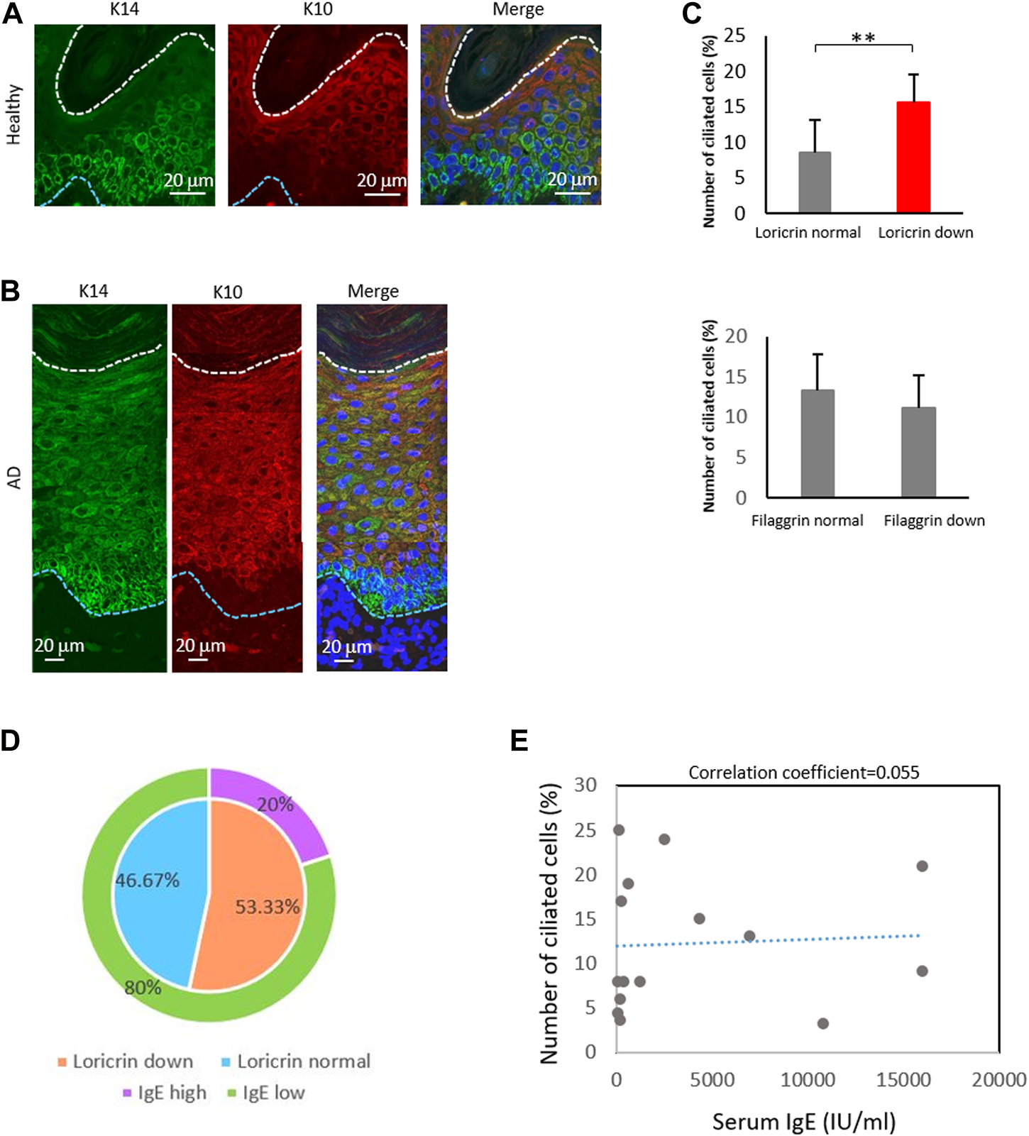 FIGURE 5. The percentage of ciliated cells negatively correlates with loricrin expression. (A,B) Immunostaining of K14 (green) and K10 (red) in (A) healthy epidermis, and in (B) atopic 975 epidermis. Nuclei were stained with hoechst 33342 (blue). The blue dotted line indicates the basal membrane. The white dotted line indicates the stratum corneum. Three biological replicates (3 donors) were examined. Scale bar: 20 μm. (C) Correlation between the number of primary ciliated cells and the epidermal barrier proteins loricrin (top) and filaggrin (bottom). AD epidermis samples derived from 15 patients were immunostained with either loricrin or filaggrin, with acetylated tubulin. Patients were classified into 2 groups based on the expression level of barrier proteins. The average percentages of primary ciliated cells in both groups were calculated. **, p < 0.01 (Student’s t-test). (D) The percentage of AD patients showing loricrin normal, loricrin low, IgE low, and IgE high. n = 15 donors. (E) Correlation between the number of ciliated cells and the serum IgE level in AD patients. n = 15 donors.