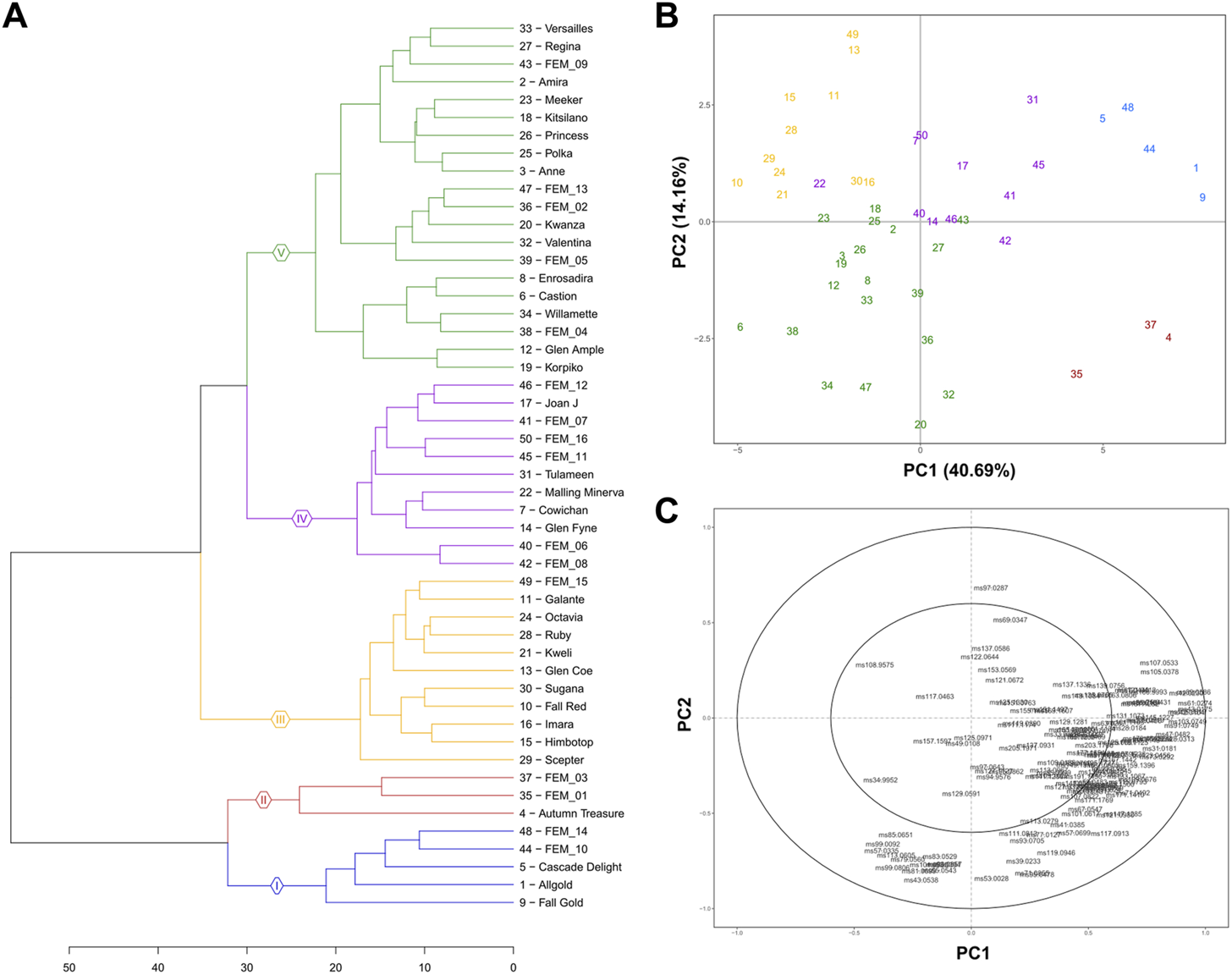 Raspberry germplasm volatilome assessed by PTR-ToF-MS. Hierarchical dendrogram (A) principal component analysis (PCA) (B) and loading plot (C) of VOC profiles of 50 raspberry accessions measured by PTR-ToF-MS. Each VOC concentration is the average of three biological replicates. Each colour of the PCA plot depicts one of the five clusters, determined by gap statistics.